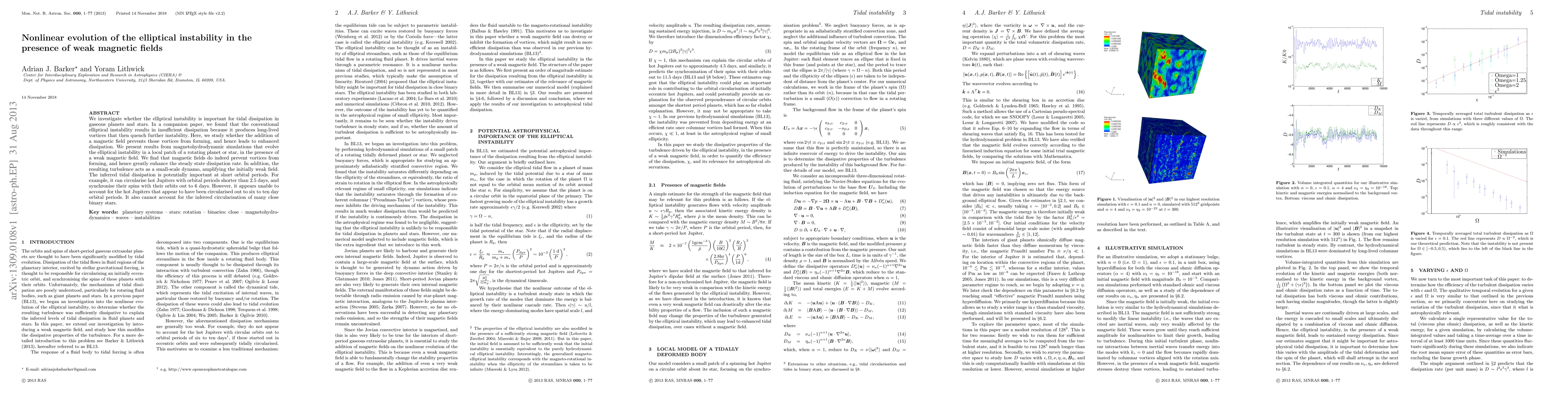 This paper examines how weak magnetic fields influence the elliptical instability in gaseous planets and stars, finding that magnetic fields prevent vortex formation and significantly enhance dissipation. The resulting turbulence amplifies the magnetic field, potentially aiding in the circularisation of hot Jupiters with short orbital periods.