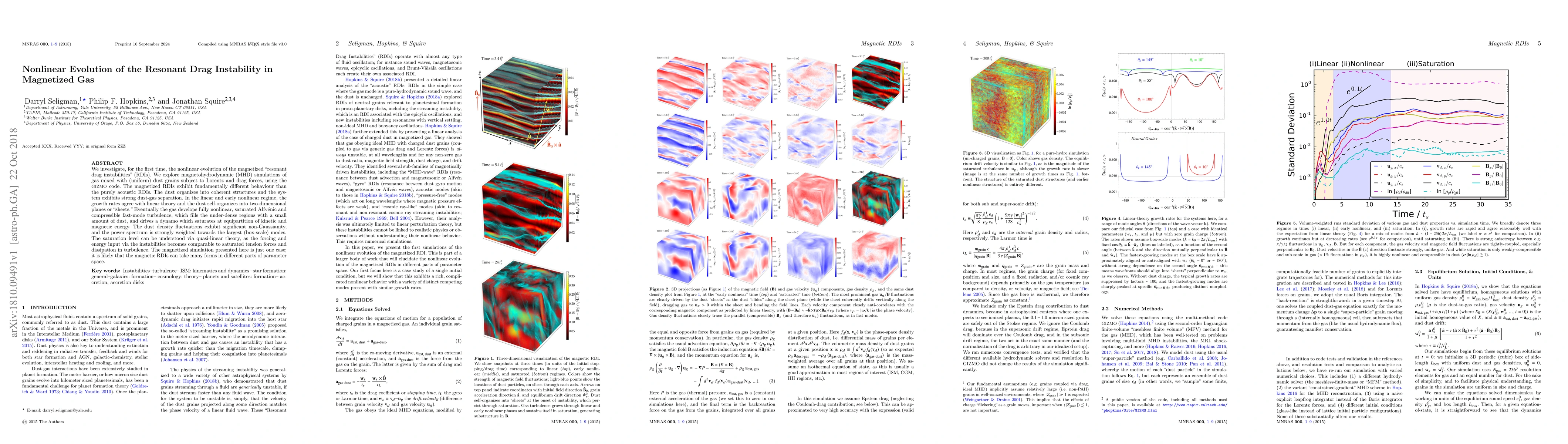 We investigate, for the first time, the nonlinear evolution of the magnetized "resonant drag instabilities" (RDIs). We explore magnetohydrodynamic (MHD) simulations of gas mixed with (uniform) dust grains subject to Lorentz and drag forces, using the GIZMO code. The magnetized RDIs exhibit fundamentally different behaviour than the purely acoustic RDIs. The dust organizes into coherent structures and the system exhibits strong dust-gas separation. In the linear and early nonlinear regime, the growth rates agree with linear theory and the dust self-organizes into two-dimensional planes or "sheets." Eventually the gas develops fully nonlinear, saturated Alfv\'enic and compressible fast-mode turbulence, which fills the under-dense regions with a small amount of dust, and drives a dynamo which saturates at equipartition of kinetic and magnetic energy. The dust density fluctuations exhibit significant non-Gaussianity, and the power spectrum is strongly weighted towards the largest (box-scale) modes. The saturation level can be understood via quasi-linear theory, as the forcing and energy input via the instabilities becomes comparable to saturated tension forces and dissipation in turbulence. The magnetized simulation presented here is just one case; it is likely that the magnetic RDIs can take many forms in different parts of parameter space.