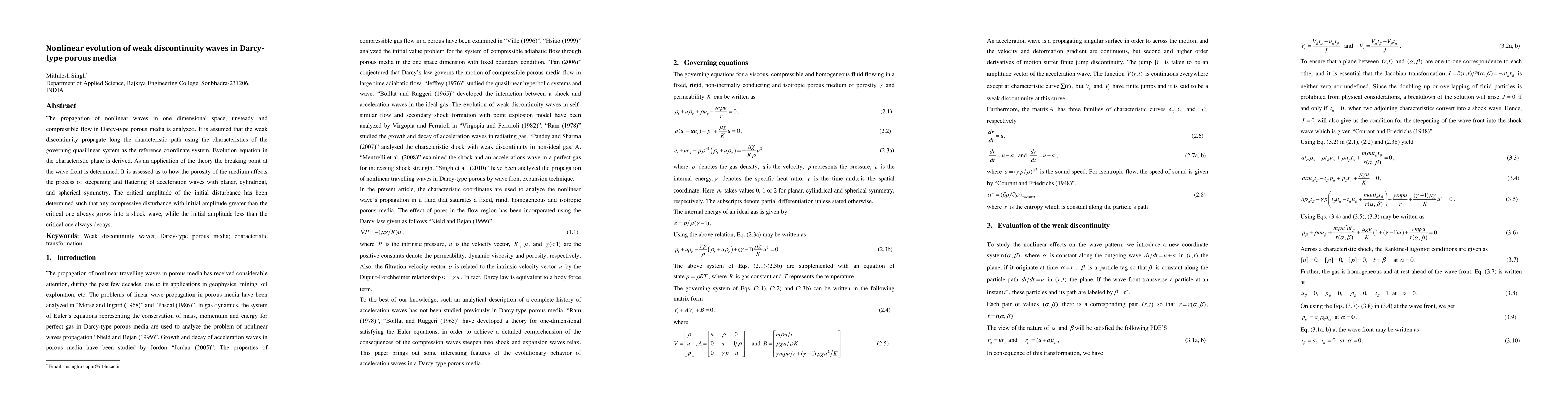 This research derives an evolution equation for nonlinear wave propagation in Darcy-type porous media, examining the impact of medium porosity on wave steepening and flattening. It determines critical amplitude thresholds for disturbance growth into shock waves or decay.