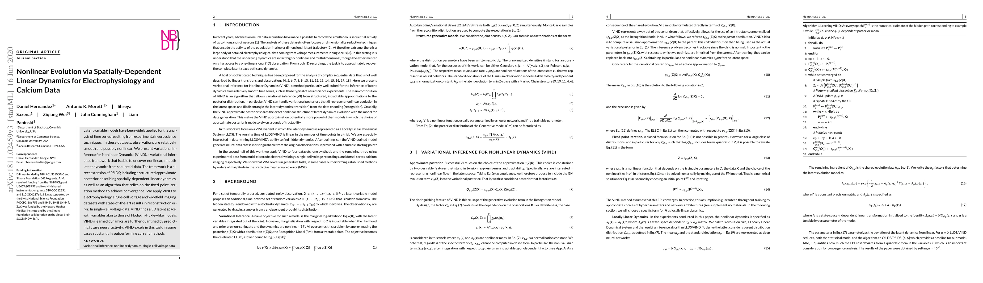 Latent variable models have been widely applied for the analysis of time series resulting from experimental neuroscience techniques. In these datasets, observations are relatively smooth and possibly nonlinear. We present Variational Inference for Nonlinear Dynamics (VIND), a variational inference framework that is able to uncover nonlinear, smooth latent dynamics from sequential data. The framework is a direct extension of PfLDS; including a structured approximate posterior describing spatially-dependent linear dynamics, as well as an algorithm that relies on the fixed-point iteration method to achieve convergence. We apply VIND to electrophysiology, single-cell voltage and widefield imaging datasets with state-of-the-art results in reconstruction error. In single-cell voltage data, VIND finds a 5D latent space, with variables akin to those of Hodgkin-Huxley-like models. VIND's learned dynamics are further quantified by predicting future neural activity. VIND excels in this task, in some cases substantially outperforming current methods.