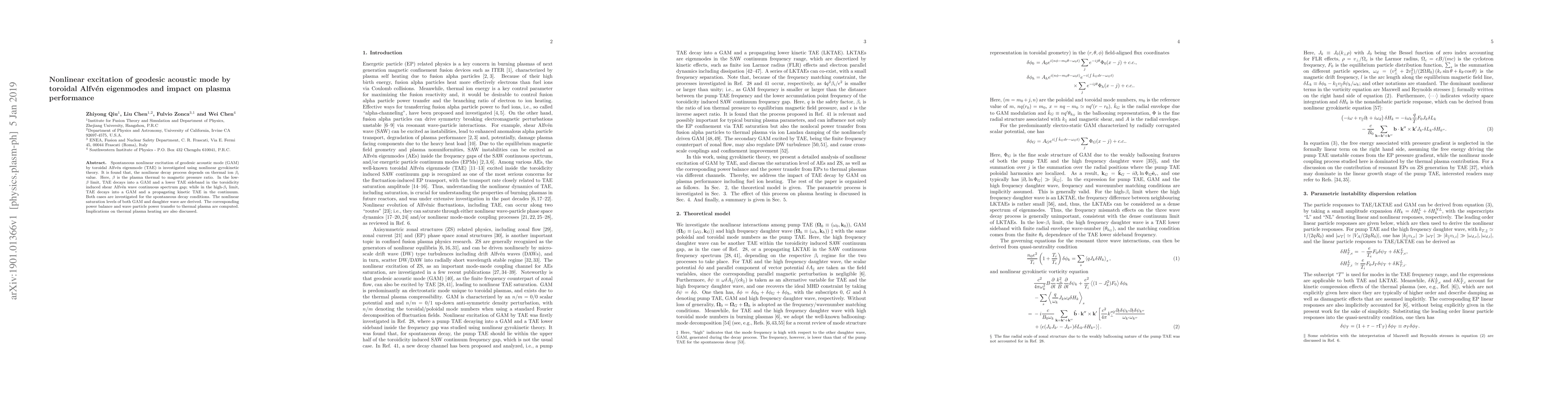 Spontaneous nonlinear excitation of geodesic acoustic mode (GAM) by toroidal Alfv\'en eigenmode (TAE) is investigated using nonlinear gyrokinetic theory. It is found that, the nonlinear decay process depends on thermal ion \beta value. Here, \beta is the plasma thermal to magnetic pressure ratio. In the low-\beta limit, TAE decays into a GAM and a lower TAE sideband in the toroidicity induced shear Alfv\'en wave continuous spectrum gap; while in the high-\beta limit, TAE decays into a GAM and a propagating kinetic TAE in the continuum. Both cases are investigated for the spontaneous decay conditions. The nonlinear saturation levels of both GAM and daughter wave are derived. The corresponding power balance and wave particle power transfer to thermal plasma are computed. Implications on thermal plasma heating are also discussed.