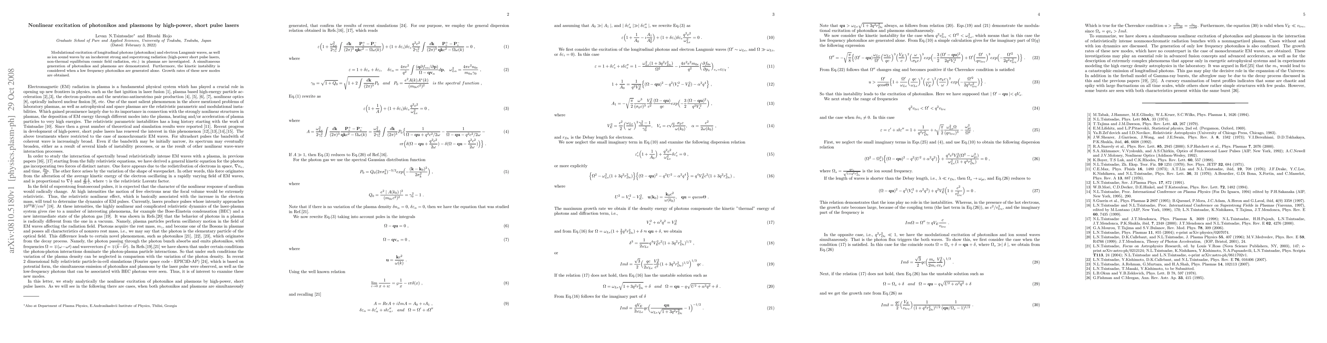 Modulational excitation of longitudinal photons (photonikos) and electron Langmuir waves, as well as ion sound waves by an incoherent strong and superstrong radiation (high-power short pulse lasers, non-thermal equilibrium cosmic field radiation, etc.) in plasmas are investigated. A simultaneous generation of photonikos and plasmons are demonstrated. Furthermore, the kinetic instability is considered when a low frequency photonikos are generated alone. Growth rates of these new modes are obtained.
