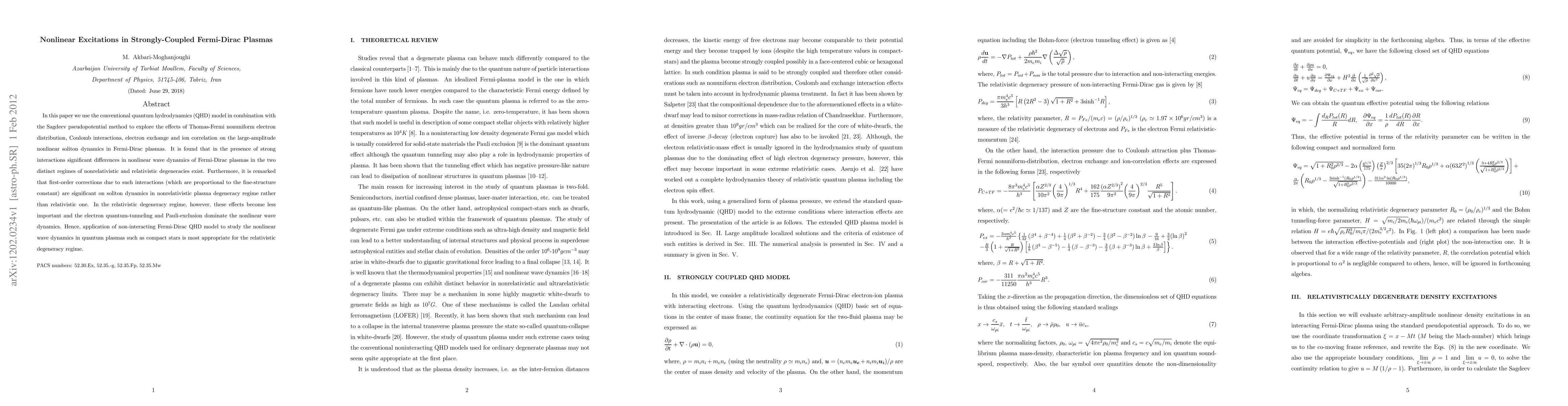 This paper investigates nonlinear soliton dynamics in strongly-coupled Fermi-Dirac plasmas using quantum hydrodynamics and the Sagdeev pseudopotential method, revealing significant differences in wave dynamics between nonrelativistic and relativistic degeneracies, with first-order corrections being more impactful in the former. In relativistic regimes, quantum tunneling and Pauli exclusion dominate.