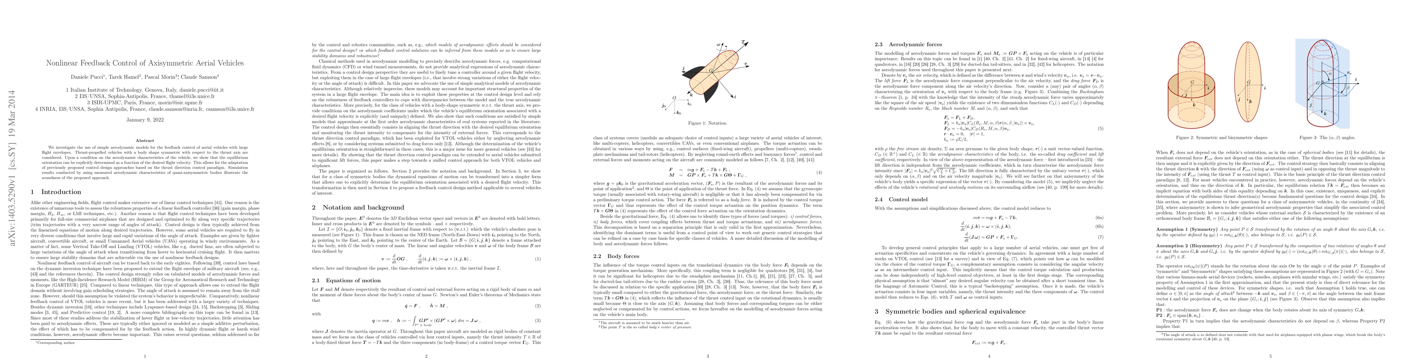 We investigate the use of simple aerodynamic models for the feedback control of aerial vehicles with large flight envelopes. Thrust-propelled vehicles with a body shape symmetric with respect to the thrust axis are considered. Upon a condition on the aerodynamic characteristics of the vehicle, we show that the equilibrium orientation can be explicitly determined as a function of the desired flight velocity. This allows for the adaptation of previously proposed control design approaches based on the thrust direction control paradigm. Simulation results conducted by using measured aerodynamic characteristics of quasi-axisymmetric bodies illustrate the soundness of the proposed approach.