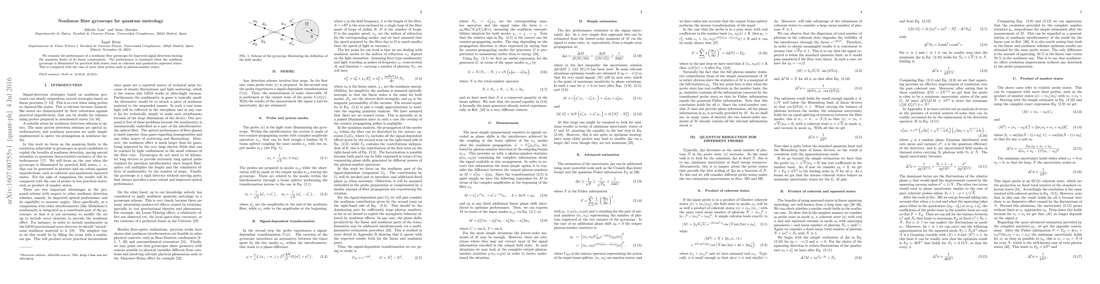 We examine the performance of a nonlinear fiber gyroscope for improved signal detection beating the quantum limits of its linear counterparts. The performance is examined when the nonlinear gyroscope is illuminated by practical field states, such as coherent and quadrature squeezed states. This is compared with the case of more ideal probes such as photon-number states.