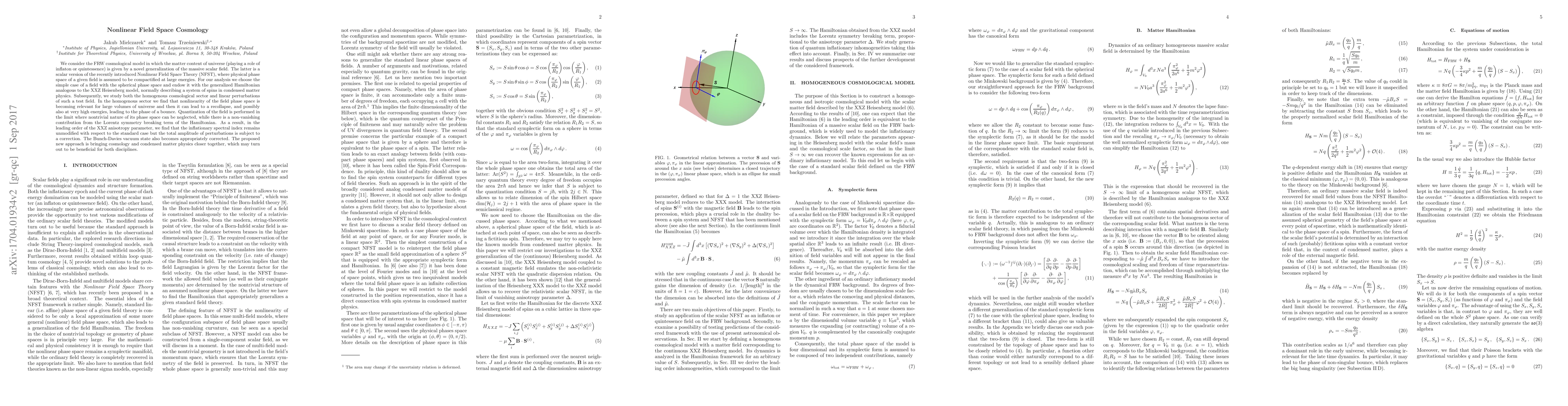 We consider the FRW cosmological model in which the matter content of universe (playing a role of inflaton or quintessence) is given by a novel generalization of the massive scalar field. The latter is a scalar version of the recently introduced Nonlinear Field Space Theory (NFST), where physical phase space of a given field is assumed to be compactified at large energies. For our analysis we choose the simple case of a field with the spherical phase space and endow it with the generalized Hamiltonian analogous to the XXZ Heisenberg model, normally describing a system of spins in condensed matter physics. Subsequently, we study both the homogenous cosmological sector and linear perturbations of such a test field. In the homogenous sector we find that nonlinearity of the field phase space is becoming relevant for large volumes of universe and then it can lead to a recollapse, and possibly also at very high energies, leading to the phase of a bounce. Quantization of the field is performed in the limit where nontrivial nature of its phase space can be neglected, while there is a non-vanishing contribution from the Lorentz symmetry breaking term of the Hamiltonian. As a result, in the leading order of the XXZ anisotropy parameter, we find that the inflationary spectral index remains unmodified with respect to the standard case but the total amplitude of perturbations is subject to a correction. The Bunch-Davies vacuum state also becomes appropriately corrected. The proposed new approach is bringing cosmology and condensed matter physics closer together, which may turn out to be beneficial for both disciplines.