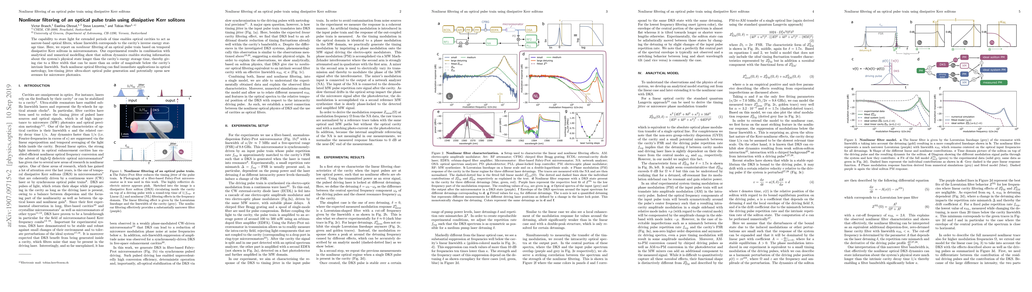 The capability to store light for extended periods of time enables optical cavities to act as narrow-band optical filters, whose linewidth corresponds to the cavity's inverse energy storage time. Here, we report on nonlinear filtering of an optical pulse train based on temporal dissipative Kerr solitons in microresonators. Our experimental results in combination with analytical and numerical modelling show that soliton dynamics enables storing information about the system's physical state longer than the cavity's energy storage time, thereby giving rise to a filter width that can be more than an order of magnitude below the cavity's intrinsic linewidth. Such nonlinear optical filtering can find immediate applications in optical metrology, low-timing jitter ultra-short optical pulse generation and potentially opens new avenues for microwave photonics.