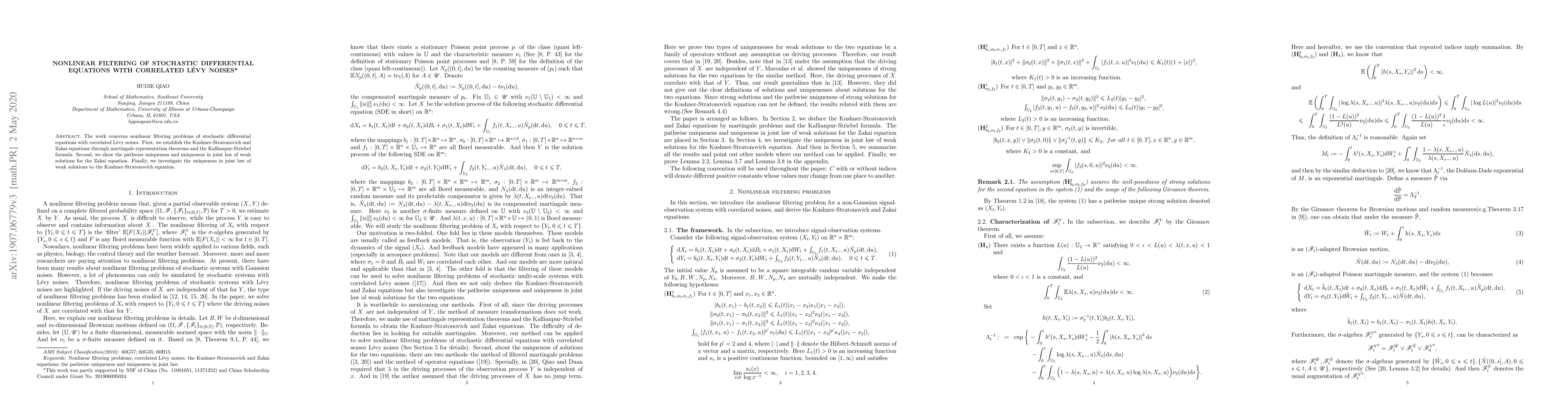 This paper addresses nonlinear filtering for stochastic differential equations driven by correlated Lévy noises, establishing Kushner-Stratonovich and Zakai equations and proving pathwise uniqueness and uniqueness in joint law for weak solutions to these equations.