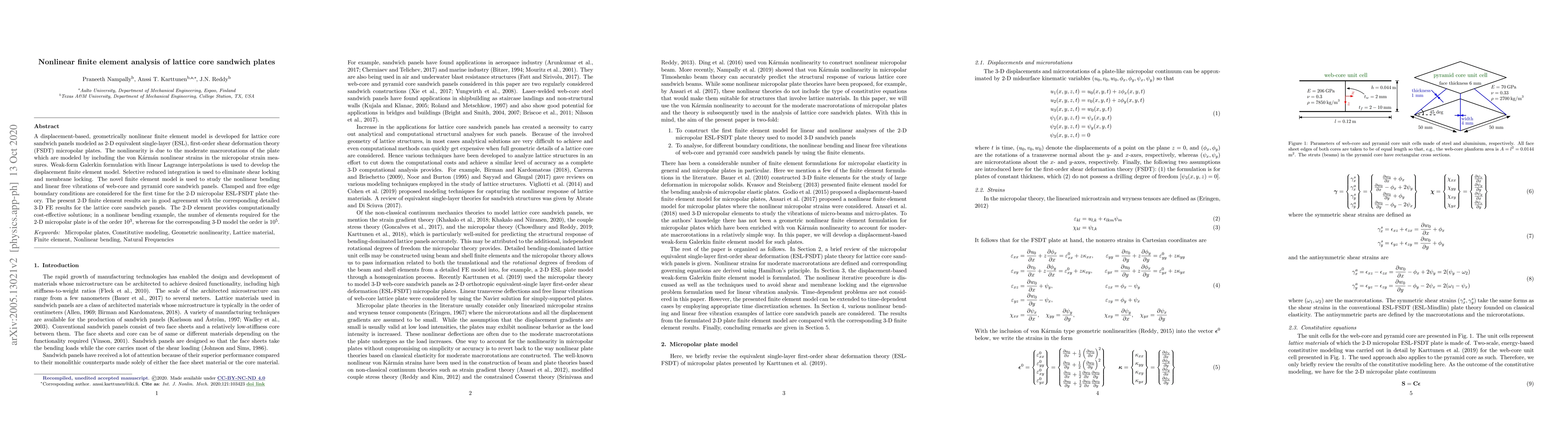 This paper presents a displacement-based, geometrically nonlinear finite element model for lattice core sandwich plates using a 2-D equivalent single-layer micropolar plate theory, focusing on moderate macrorotations and selective reduced integration to eliminate locking. The model's effectiveness is demonstrated through nonlinear bending and free vibration analyses, showing good agreement with 3-D results and significant computational efficiency.