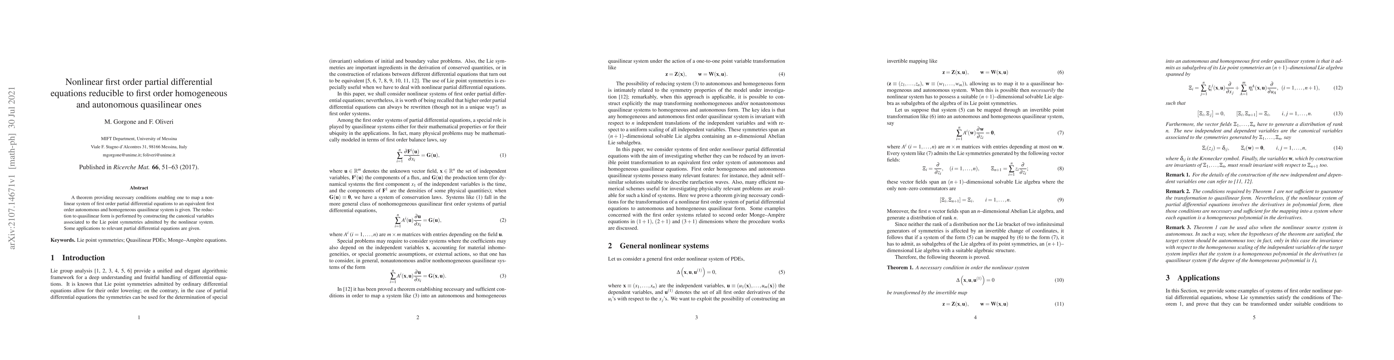 The paper presents a theorem for mapping nonlinear first-order partial differential equations to first-order homogeneous and autonomous quasilinear systems via canonical variables derived from Lie point symmetries. Applications to specific PDEs are also discussed.