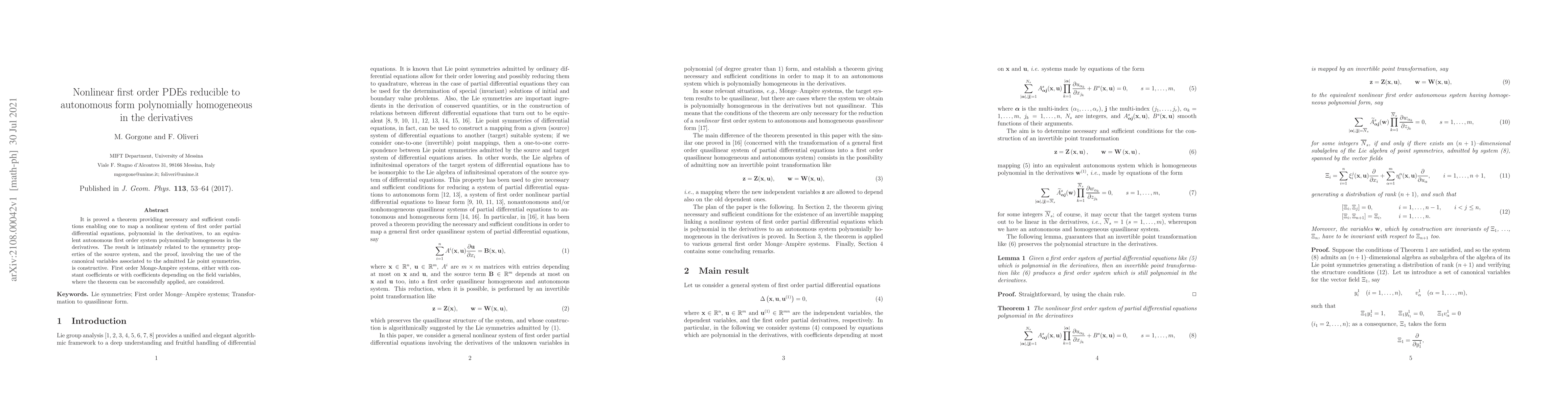 It is proved a theorem providing necessary and sufficient conditions enabling one to map a nonlinear system of first order partial differential equations, polynomial in the derivatives, to an equivalent autonomous first order system polynomially homogeneous in the derivatives. The result is intimately related to the symmetry properties of the source system, and the proof, involving the use of the canonical variables associated to the admitted Lie point symmetries, is constructive. First order Monge-Amp\`ere systems, either with constant coefficients or with coefficients depending on the field variables, where the theorem can be successfully applied, are considered.