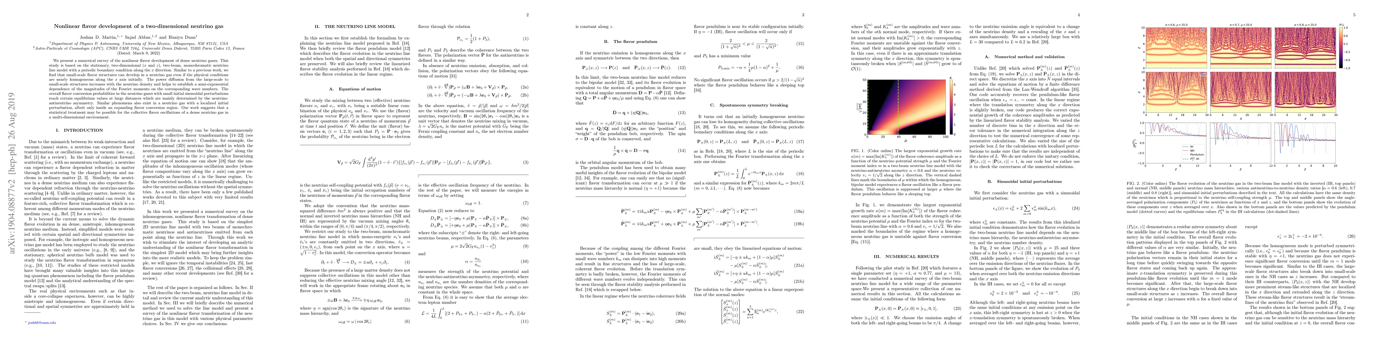 We present a numerical survey of the nonlinear flavor development of dense neutrino gases. This study is based on the stationary, two-dimensional ($x$ and $z$), two-beam, monochromatic neutrino line model with a periodic boundary condition along the $x$ direction. Similar to a previous work, we find that small-scale flavor structures can develop in a neutrino gas even if the physical conditions are nearly homogeneous along the $x$ axis initially. The power diffusion from the large-scale to small-scale structures increases with the neutrino density and helps to establish a semi-exponential dependence of the magnitudes of the Fourier moments on the corresponding wave numbers. The overall flavor conversion probabilities in the neutrino gases with small initial sinusoidal perturbations reach certain equilibrium values at large distances which are mainly determined by the neutrino-antineutrino asymmetry. Similar phenomena also exist in a neutrino gas with a localized initial perturbation, albeit only inside an expanding flavor conversion region. Our work suggests that a statistical treatment may be possible for the collective flavor oscillations of a dense neutrino gas in a multi-dimensional environment.