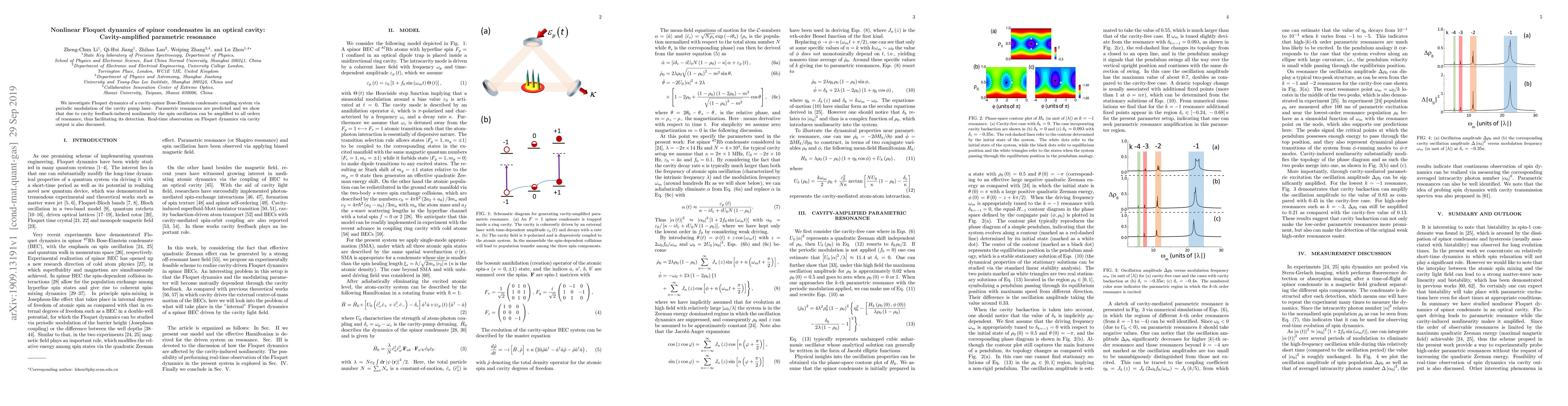 This paper explores the nonlinear Floquet dynamics of a spinor Bose-Einstein condensate within an optical cavity modulated by a pump laser, predicting parametric resonances. The study reveals that cavity-induced feedback can amplify spin oscillations to all resonance orders, enhancing their detectability, and discusses real-time observation methods.