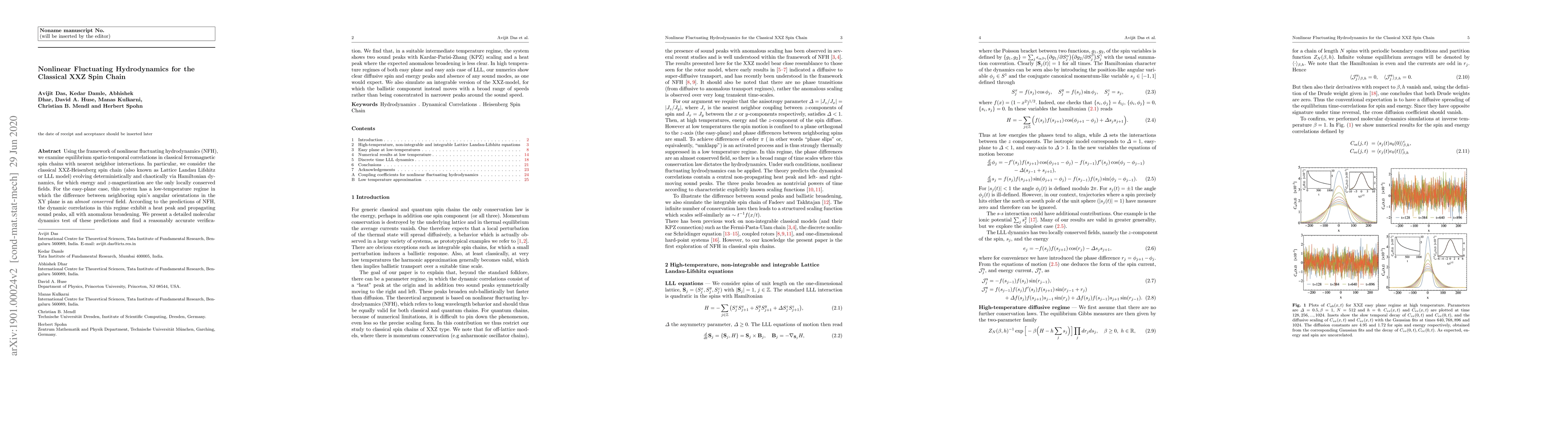 This paper explores equilibrium spatio-temporal correlations in the classical XXZ spin chain using nonlinear fluctuating hydrodynamics, revealing heat and sound peaks with anomalous broadening in low-temperature regimes. Molecular dynamics simulations confirm these predictions, showing diffusive behavior and absence of sound modes in high temperatures.