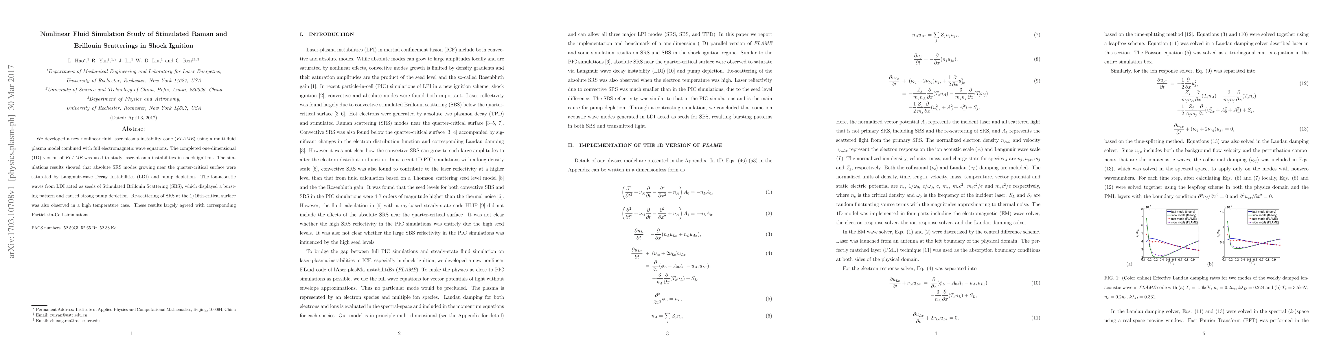 We developed a new nonlinear fluid laser-plasma-instability code (FLAME) using a multi-fluid plasma model combined with full electromagnetic wave equations. The completed one-dimensional (1D) version of FLAME was used to study laser-plasma instabilities in shock ignition. The simulations results showed that absolute SRS modes growing near the quarter-critical surface were saturated by Langmuir-wave Decay Instabilities (LDI) and pump depletion. The ion-acoustic waves from LDI acted as seeds of stimulated Brillouin Scattering (SBS), which displayed a bursting pattern and caused strong pump depletion. Re-scattering of SRS at the 1/16th-critical surface was also observed in a high temperature case. These results largely agreed with corresponding Particle-in-Cell simulations.