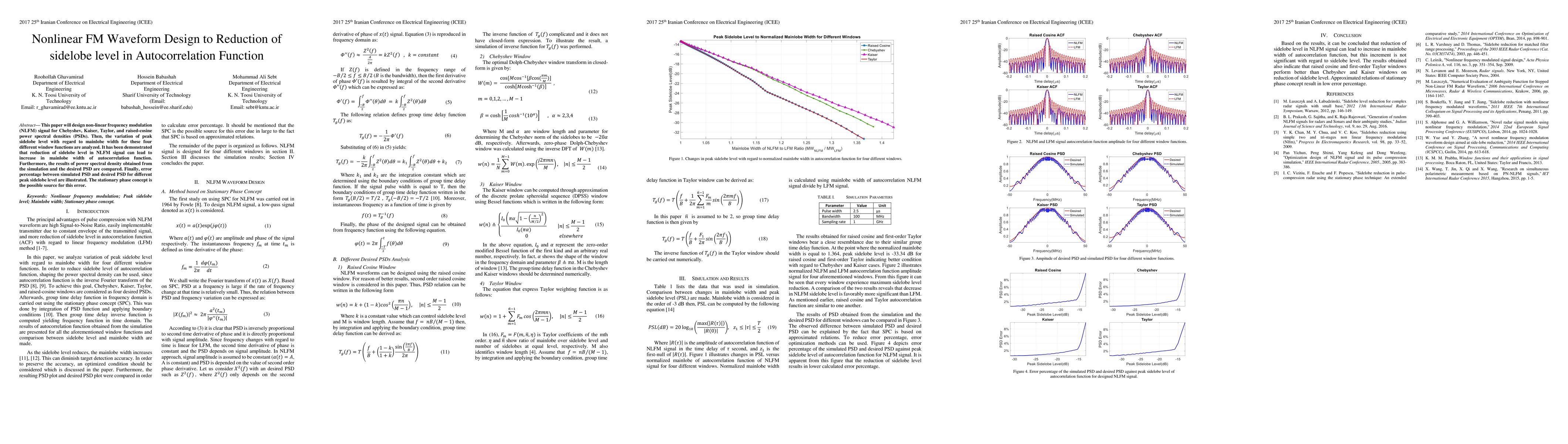 This paper designs nonlinear frequency modulation (NLFM) signals with various window functions to reduce sidelobe levels in the autocorrelation function. It analyzes the trade-off between sidelobe reduction and mainlobe width and compares simulated power spectral densities to desired values, attributing discrepancies to the stationary phase concept.