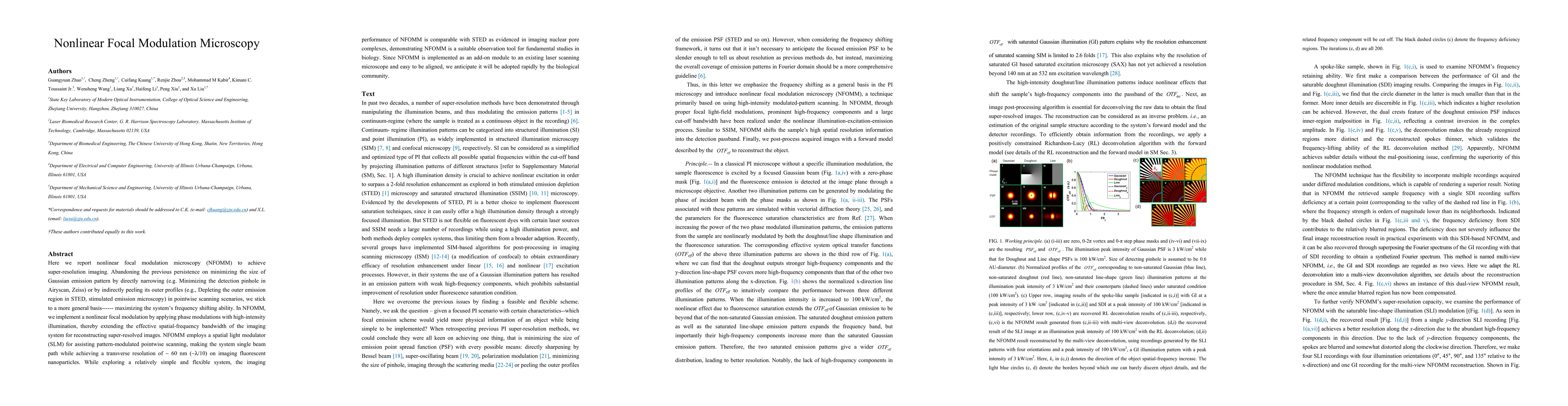Nonlinear focal modulation microscopy (NFOMM) achieves super-resolution imaging by maximizing the system's frequency shifting ability through high-intensity illumination and phase modulations, employing a spatial light modulator for pattern-modulated scanning. NFOMM demonstrates comparable imaging performance to STED and offers a simple, flexible, and easily adoptable tool for biological studies.