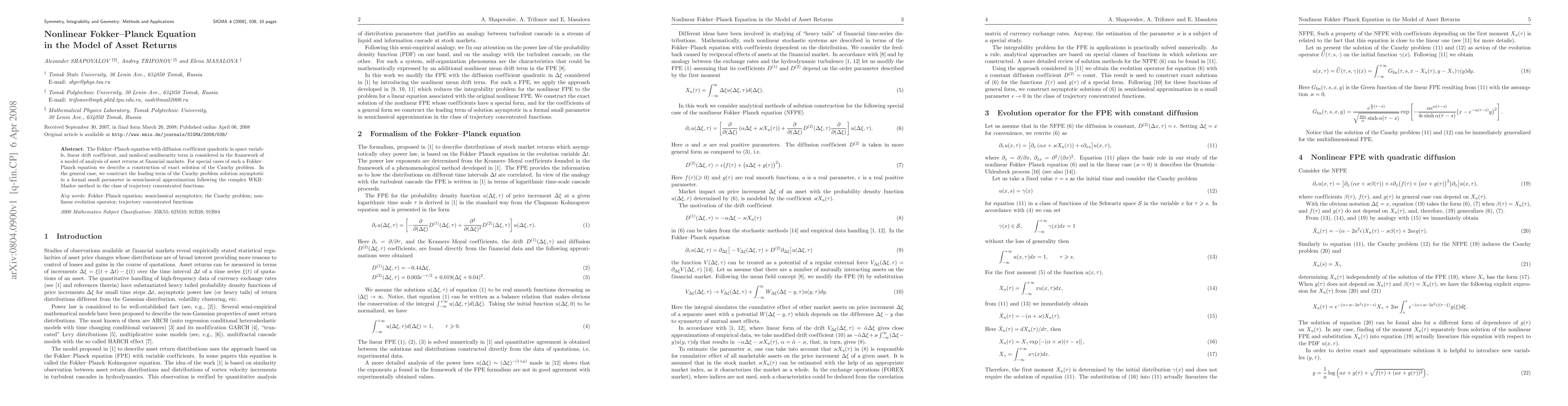 Researchers studied a mathematical model of asset returns using a modified Fokker-Planck equation with quadratic diffusion and nonlocal nonlinearity terms. They developed an approximation method to find solutions in the general case.