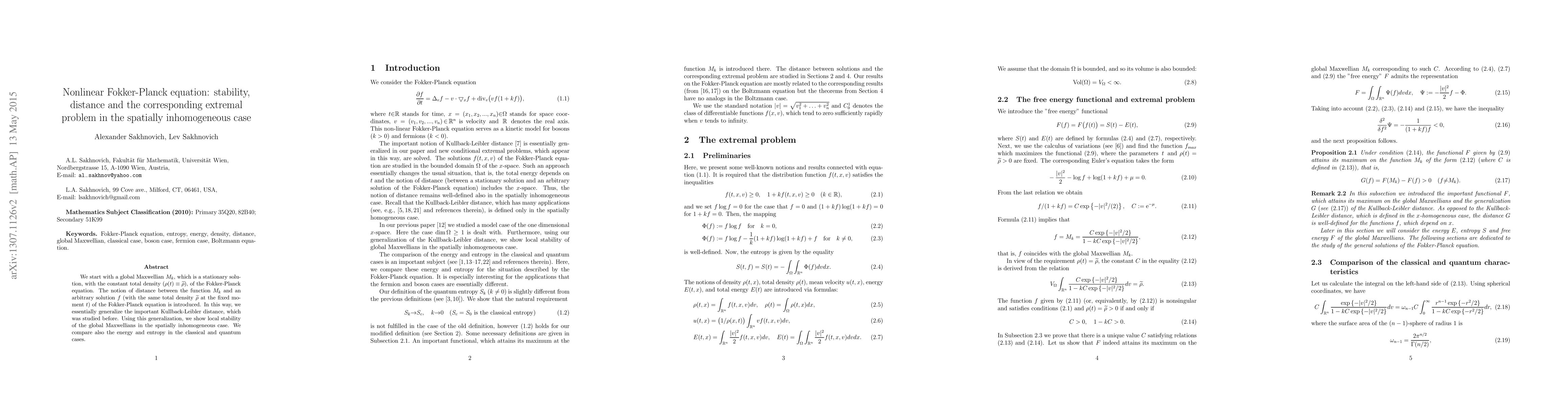 This paper introduces a generalized distance metric for solutions of the Fokker-Planck equation, extending the Kullback-Leibler distance, and demonstrates local stability of global Maxwellians under spatial inhomogeneity. It also compares energy and entropy in classical and quantum contexts.