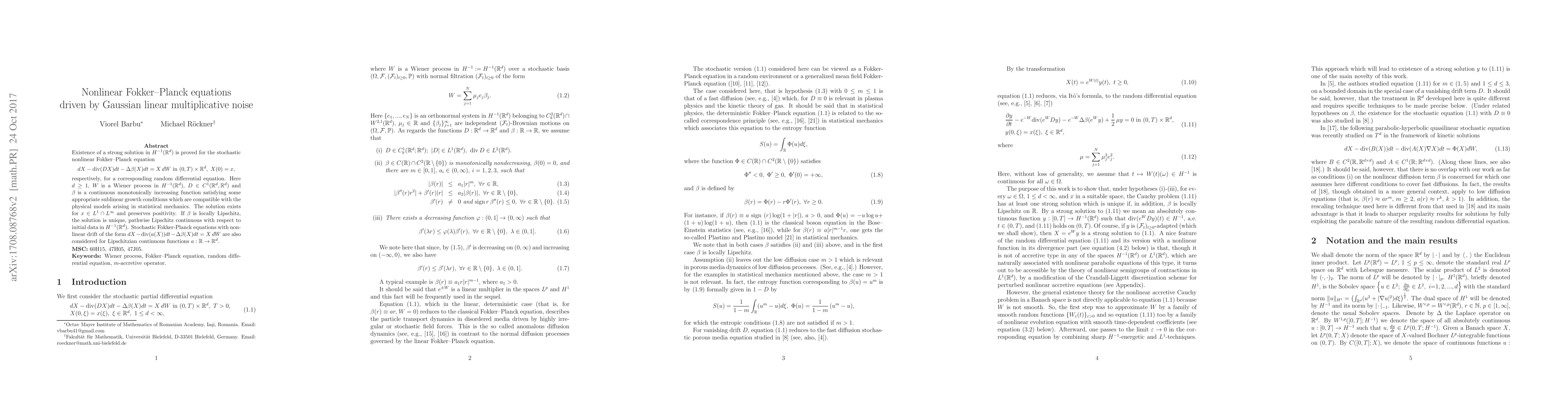 Existence and uniqueness of a strong solution in $H^{-1}(\mathbb R^d)$ is proved for the stochastic nonlinear Fokker-Planck equation $$dX-{\rm div}(DX)dt-\Delta\beta(X)dt=X\,dW \mbox{ in }(0,T)\times\mathbb R^d,\ X(0)=x,$$ via a corresponding random differential equation. Here $d\geq 1$, $W$ is a Wiener process in $H^{-1}(\mathbb R^d)$, $D\in C^1(\mathbb R^d,\mathbb R^d)$ and $\beta$ is a continuous monotonically increasing function. The solution exists for $x\in L^1\cap L^\infty$ and preserves positivity. If $\beta \in L^1_{\rm loc}(\mathbb R)$, the solution is pathwise Lipschitz continuous with respect to initial data in $H^{-1}(\mathbb R^d)$. Stochastic Fokker-Planck equations with nonlinear drift of the form $dX-{\rm div}(a(X))dt-\Delta\beta(X)dt=X\,dW$ are also considered for Lipschitzian continuous functions $a:\mathbb R\to\mathbb R^d$.