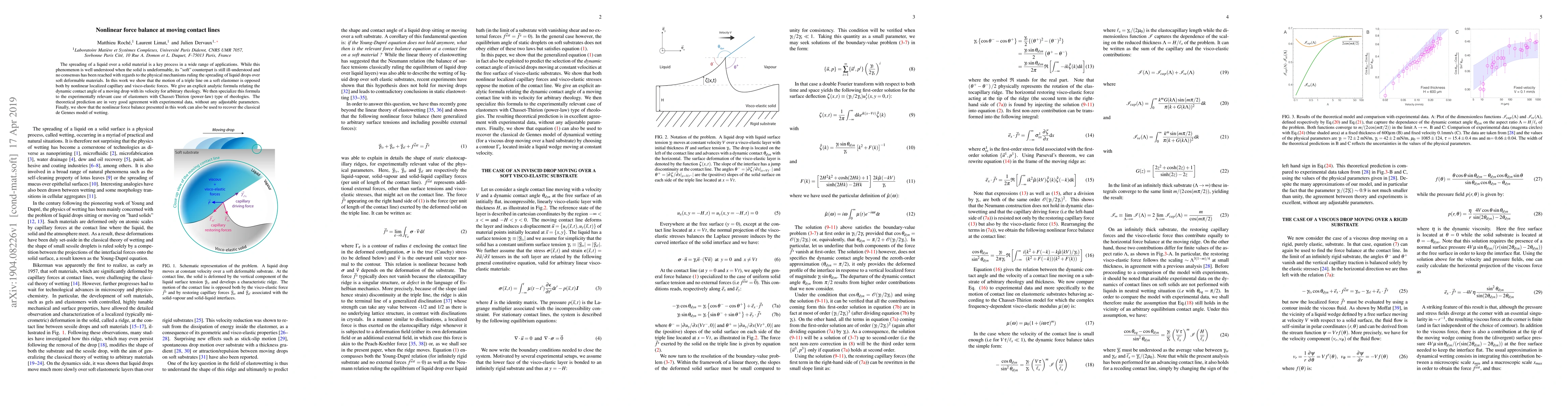 The spreading of a liquid over a solid material is a key process in a wide range of applications. While this phenomenon is well understood when the solid is undeformable, its "soft" counterpart is still ill-understood and no consensus has been reached with regards to the physical mechanisms ruling the spreading of liquid drops over soft deformable materials. In this work we show that the motion of a triple line on a soft elastomer is opposed both by nonlinear localized capillary and visco-elastic forces. We give an explicit analytic formula relating the dynamic contact angle of a moving drop with its velocity for arbitrary rheology. We then specialize this formula to the experimentally relevant case of elastomers with Chasset-Thirion (power-law) type of rheologies. The theoretical prediction are in very good agreement with experimental data, without any adjustable parameters. Finally, we show that the nonlinear force balance presented in this work can also be used to recover the classical de Gennes model of wetting.