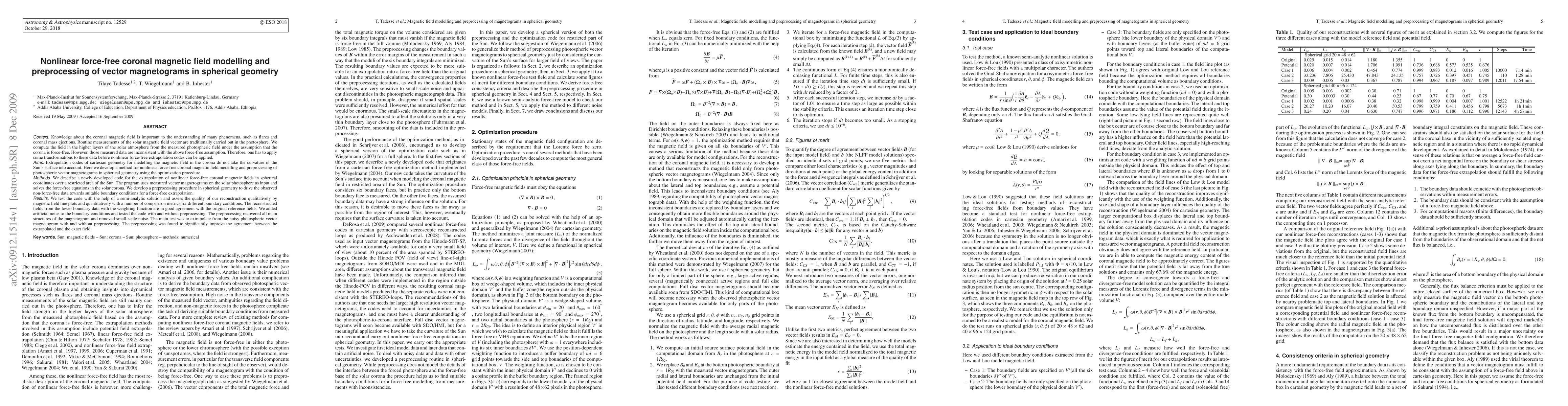 This paper develops a method for nonlinear force-free coronal magnetic field modeling using spherical geometry and optimization procedures. The new code successfully extrapolates magnetic fields from photospheric vector magnetograms, with preprocessing significantly improving the reconstruction accuracy even under noisy conditions.