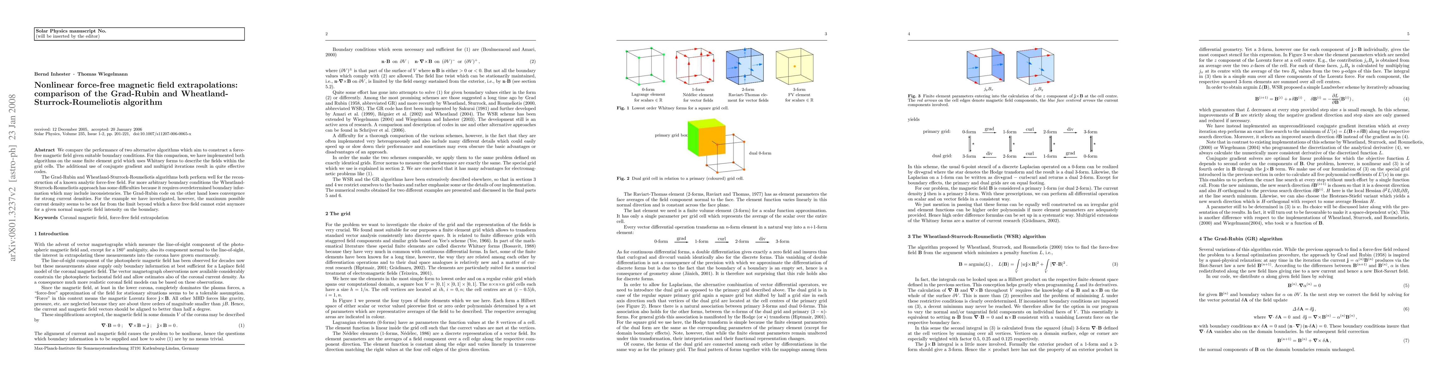 We compare the performance of two alternative algorithms which aim to construct a force-free magnetic field given suitable boundary conditions. For this comparison, we have implemented both algorithms on the same finite element grid which uses Whitney forms to describe the fields within the grid cells. The additional use of conjugate gradient and multigrid iterations result in quite effective codes. The Grad-Rubin and Wheatland-Sturrock-Roumeliotis algorithms both perform well for the reconstruction of a known analytic force-free field. For more arbitrary boundary conditions the Wheatland-Sturrock-Roumeliotis approach has some difficulties because it requires overdetermined boundary information which may include inconsistencies. The Grad-Rubin code on the other hand loses convergence for strong current densities. For the example we have investigated, however, the maximum possible current density seems to be not far from the limit beyond which a force free field cannot exist anymore for a given normal magnetic field intensity on the boundary.