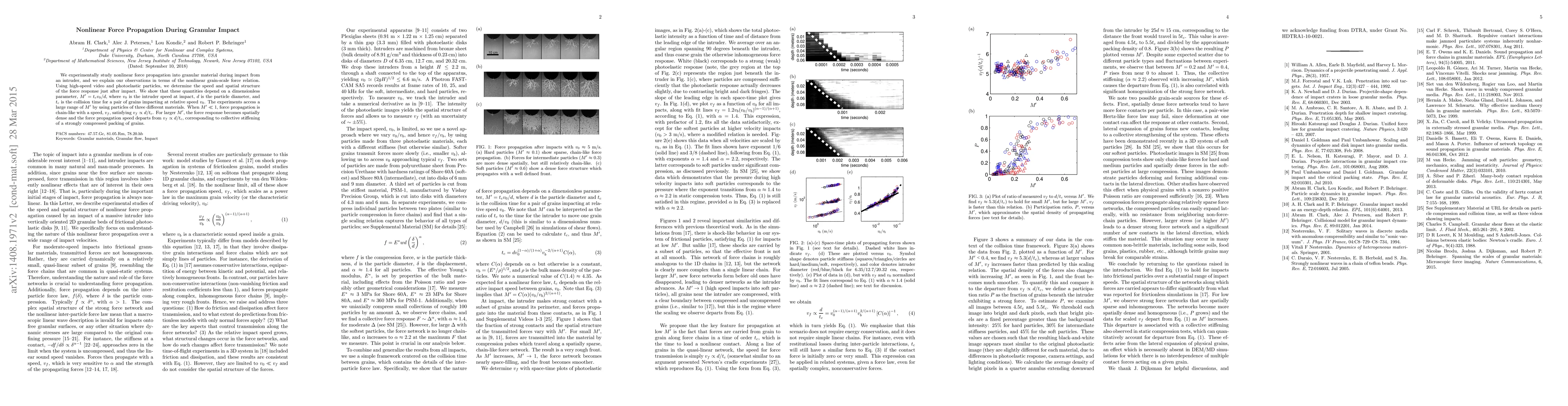 We experimentally study nonlinear force propagation into granular material during impact from an intruder, and we explain our observations in terms of the nonlinear grain-scale force relation. Using high-speed video and photoelastic particles, we determine the speed and spatial structure of the force response just after impact. We show that these quantities depend on a dimensionless parameter, $M'=t_c v_0/d$, where $v_0$ is the intruder speed at impact, $d$ is the particle diameter, and $t_c$ is the collision time for a pair of grains impacting at relative speed $v_0$. The experiments access a large range of $M'$ by using particles of three different materials. When $M' \ll 1$, force propagation is chain-like with a speed, $v_f$, satisfying $v_f \propto d/t_c$. For larger $M'$, the force response becomes spatially dense and the force propagation speed departs from $v_f\propto d/t_c$, corresponding to collective stiffening of a strongly compressed packing of grains.