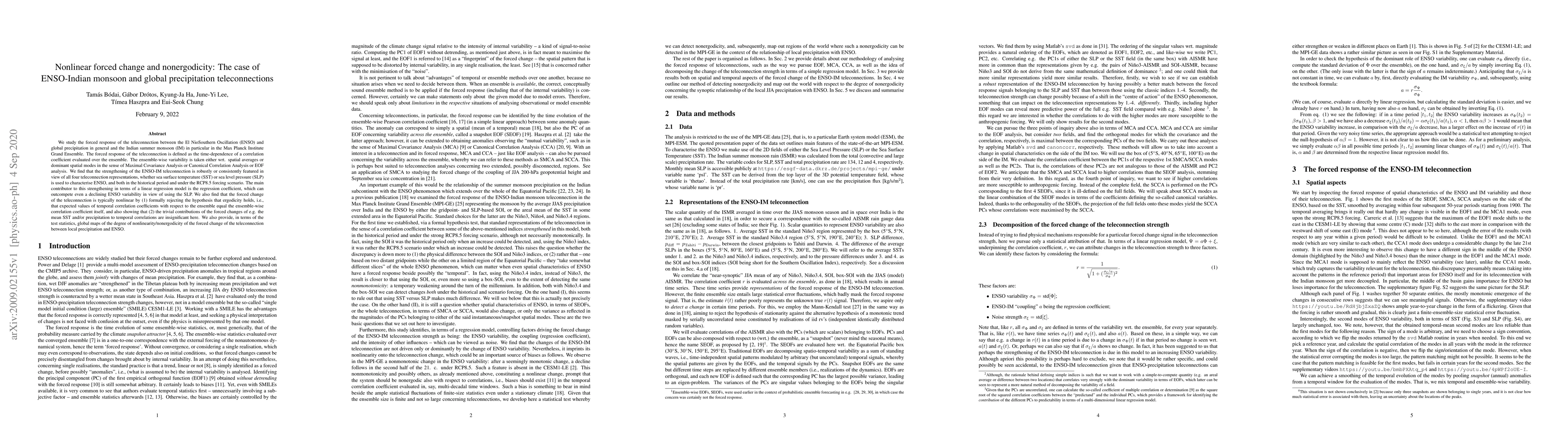 We study the forced response of the teleconnection between the El Nino-Southern Oscillation (ENSO) and global precipitation in general and the Indian summer monsoon (IM) in particular in the Max Planck Institute Grand Ensemble. The forced response of the teleconnection is defined as the time-dependence of a correlation coefficient evaluated over the ensemble. The ensemble-wise variability is taken either wrt. spatial averages or dominant spatial modes in the sense of Maximal Covariance Analysis or Canonical Correlation Analysis or EOF analysis. We find that the strengthening of the ENSO-IM teleconnection is robustly or consistently featured in view of all four teleconnection representations, whether sea surface temperature (SST) or sea level pressure (SLP) is used to characterise ENSO, and both in the historical period and under the RCP8.5 forcing scenario. The main contributor to this strengthening in terms of a linear regression model is the regression coefficient, which can outcompete even a declining ENSO variability in view of using the SLP. We also find that the forced change of the teleconnection is typically nonlinear by (1) formally rejecting the hypothesis that ergodicity holds, i.e., that expected values of temporal correlation coefficients with respect to the ensemble equal the ensemble-wise correlation coefficient itself, and also showing that (2) the trivial contributions of the forced changes of e.g. the mean SST and/or precipitation to temporal correlations are insignificant here. We also provide, in terms of the test statistics, global maps of the degree of nonlinearity/nonergodicity of the forced change of the teleconnection between local precipitation and ENSO.