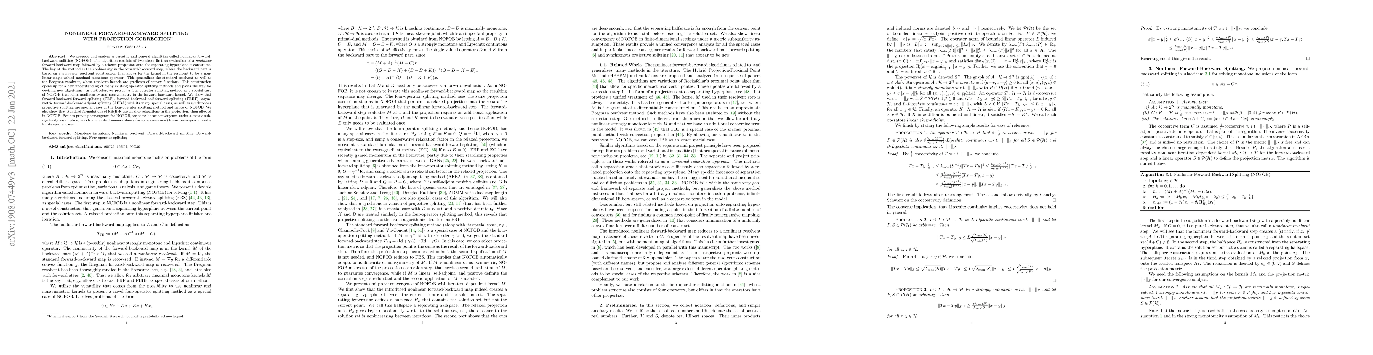 This paper introduces a nonlinear forward-backward splitting algorithm (NOFOB) that generalizes existing operator splitting methods through a nonlinear resolvent construction. It demonstrates convergence and linear convergence under certain conditions, and shows that several existing splitting methods are special cases of NOFOB.