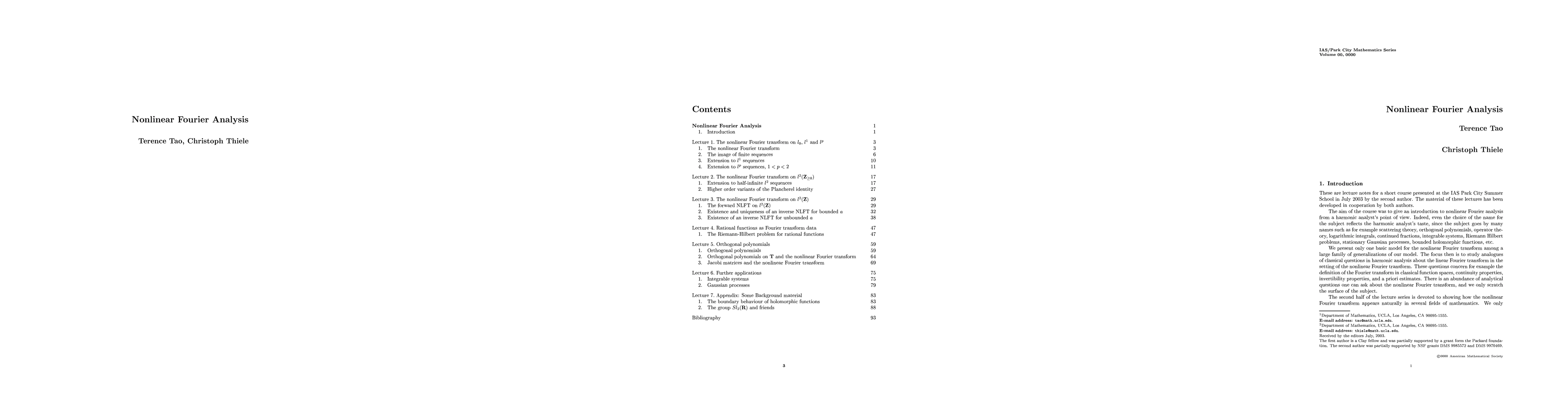 This paper explores the nonlinear Fourier transform, mapping potentials of a one-dimensional discrete Dirac operator to transmission and reflection coefficients, highlighting its nonlinear extension of the classical Fourier series and its analogous analytic properties. The content is based on lectures from the 2003 Park City Mathematics Institute.
