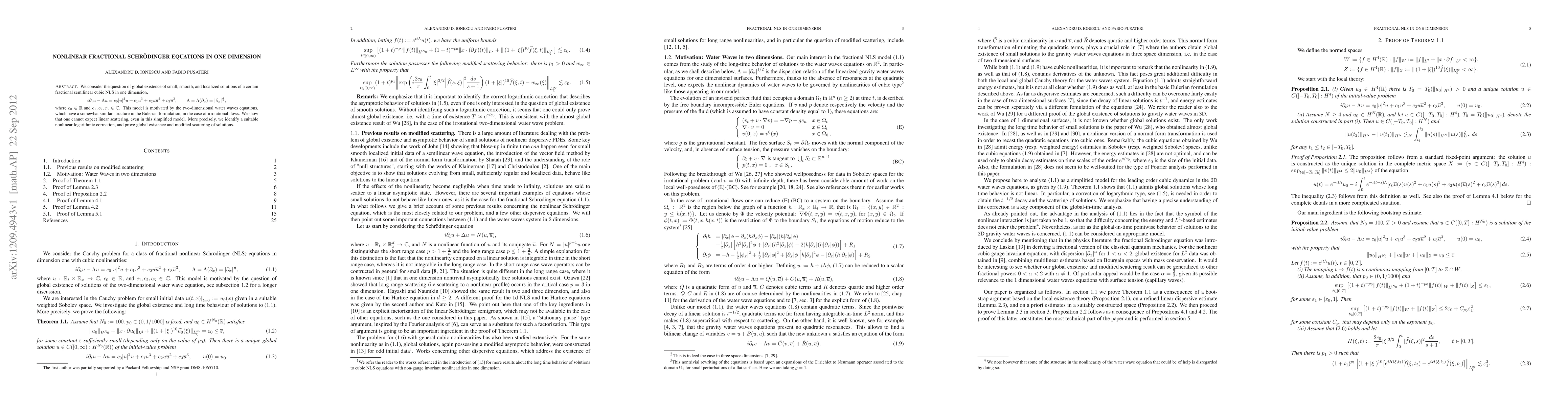 This paper investigates the global existence of small, smooth, and localized solutions for a nonlinear fractional Schrödinger equation in one dimension, revealing that linear scattering is not possible and presenting a nonlinear logarithmic correction for modified scattering.