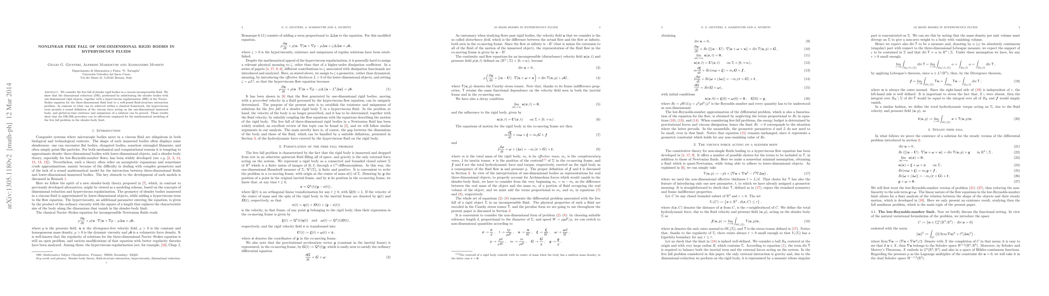 This paper investigates the free fall of slender rigid bodies in viscous incompressible fluids, demonstrating that dimensional reduction and hyperviscous regularization of the Navier-Stokes equations yield a well-posed fluid-structure interaction problem, allowing for a precise definition of viscous forces on one-dimensional objects. The method is shown to be effective for modeling free fall in the slender-body limit.