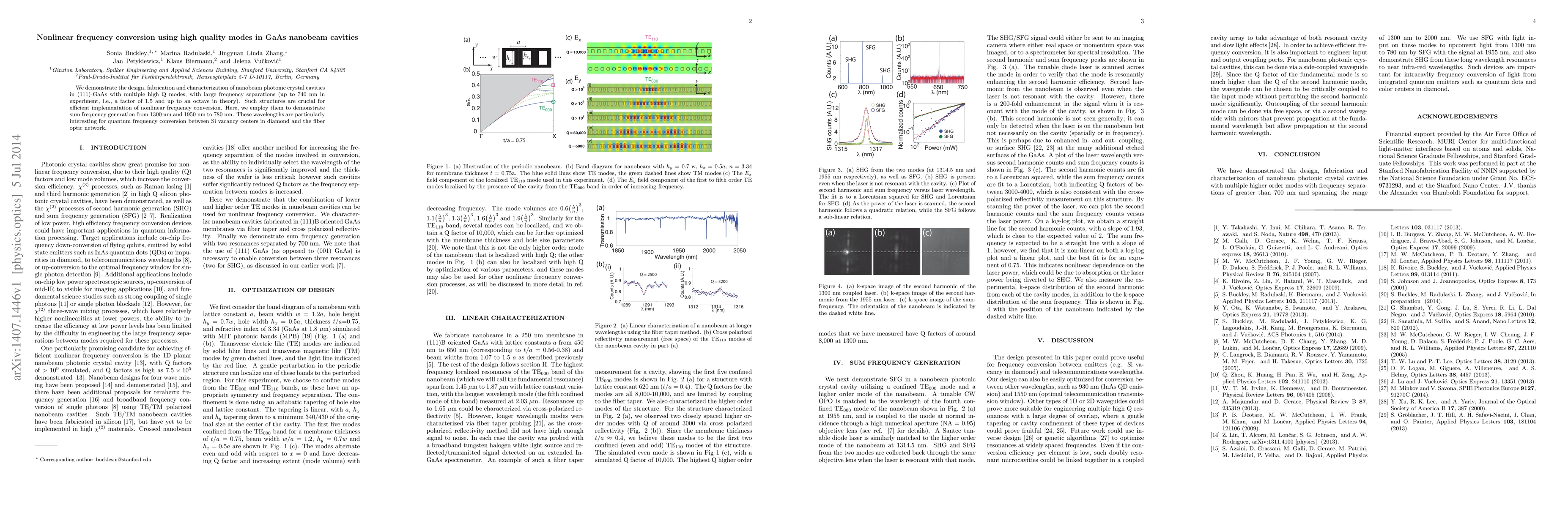 This paper describes the design and fabrication of GaAs nanobeam photonic crystal cavities with high quality factor modes, enabling efficient nonlinear frequency conversion, specifically demonstrating sum frequency generation from 1300 nm and 1950 nm to 780 nm, crucial for quantum communication applications.
