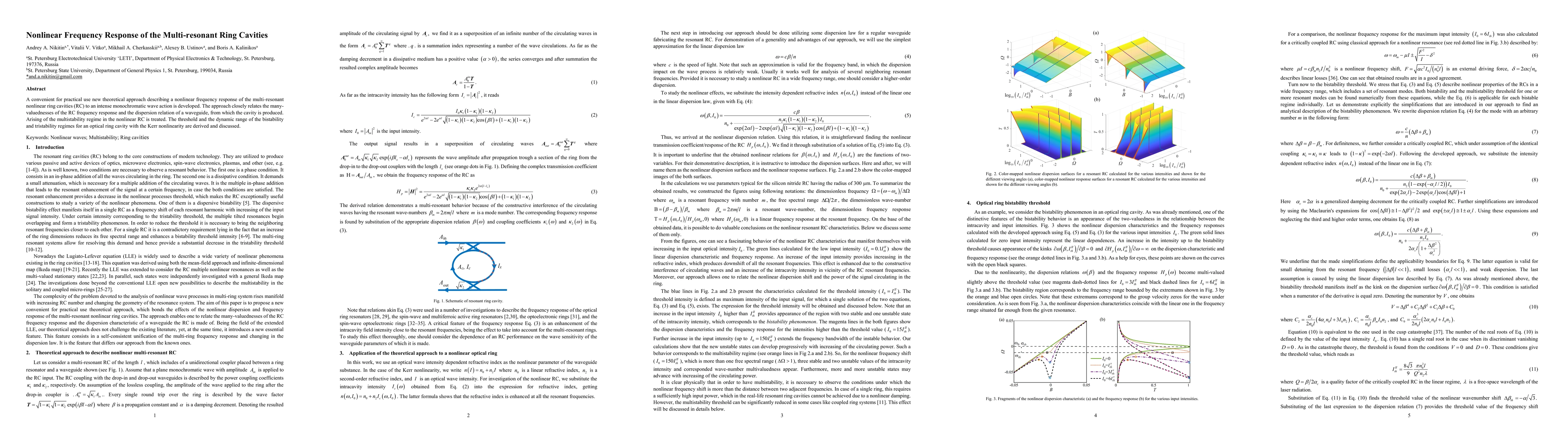 A new approach is introduced to describe the nonlinear frequency response of multi-resonant ring cavities, revealing multistability regimes with thresholds and dynamic ranges for optical ring cavities.