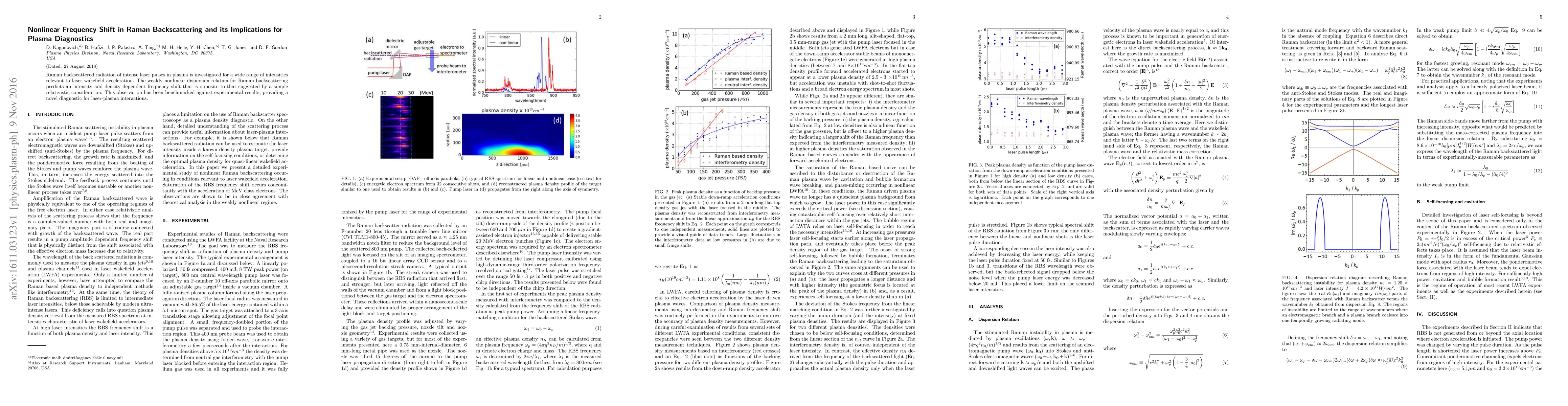 This paper investigates the nonlinear frequency shift in Raman backscattering from intense laser pulses in plasma, revealing an intensity and density-dependent shift opposite to simple relativistic predictions. Experimental results validate this finding, offering a new diagnostic tool for laser-plasma interactions.