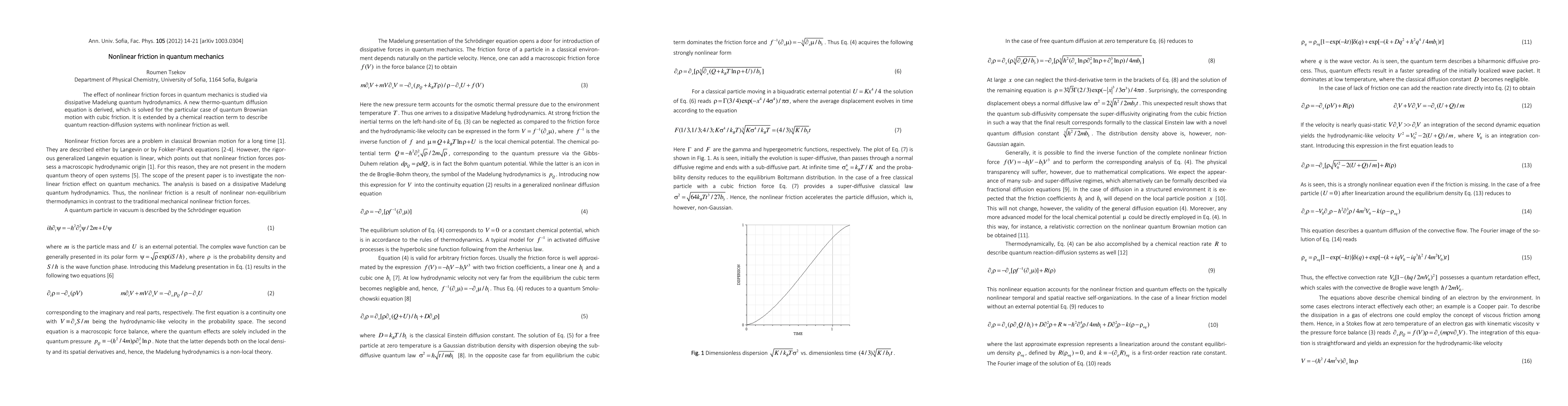 This paper investigates nonlinear friction forces in quantum mechanics using dissipative Madelung hydrodynamics, deriving a new thermo-quantum diffusion equation and solving it for quantum Brownian motion with cubic friction, while also extending it to describe quantum reaction-diffusion systems with nonlinear friction.