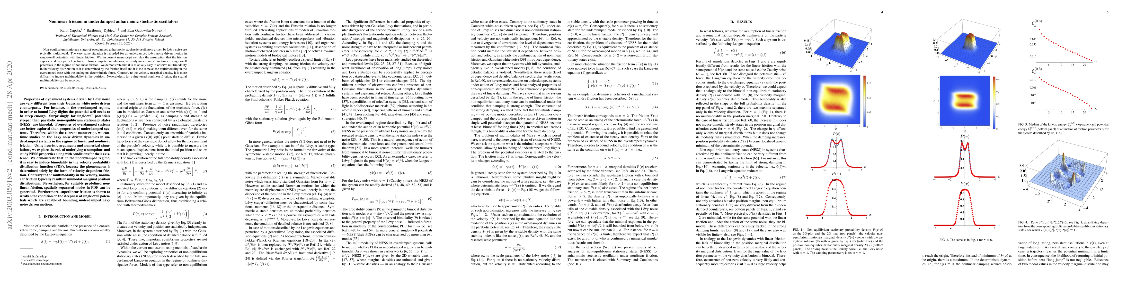 Stationary states of overdamped anharmonic stochastic oscillators driven by L\'evy noise are typically multimodal. The very same situation is recorded for an underdamped L\'evy noise driven motion in single-well potentials with linear friction. Within current manuscript we relax the assumption that the friction experienced by a particle is linear. Using computer simulations, we study underdamped motion in single-well potentials in the regime of nonlinear friction. We demonstrate that it is relatively easy to observe multimodality in the velocity distribution as it is determined by the friction itself and it is the same as the multimodality in the overdamped case with the analogous deterministic force. Contrary to the velocity marginal density, it is more difficult to produce multimodality in the position. Nevertheless, for fine-tuned nonlinear friction, the spatial multimodality can be recorded.