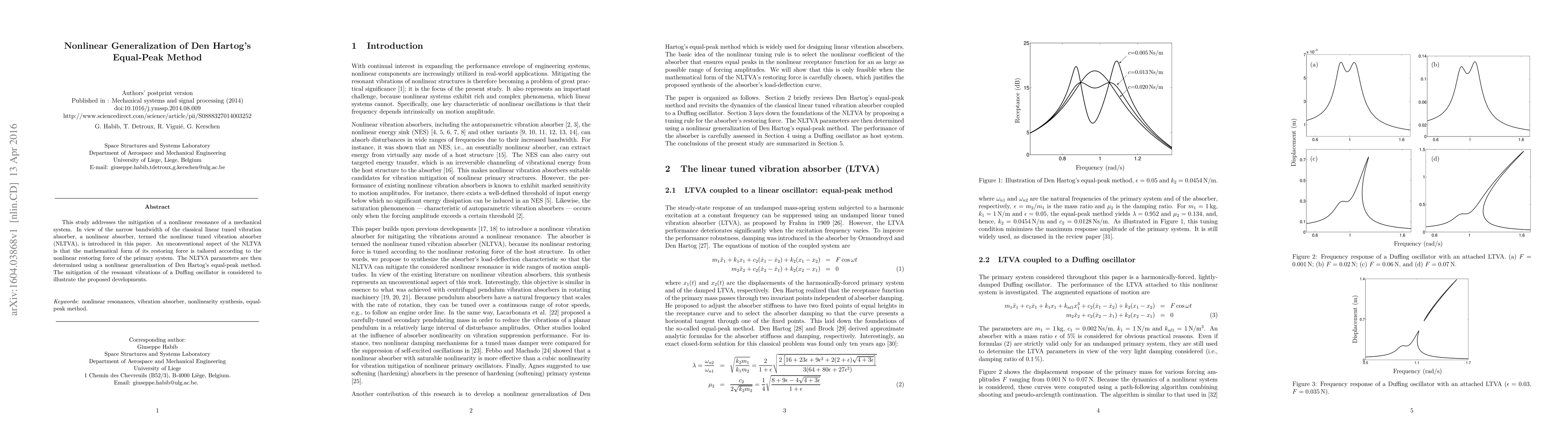 This study addresses the mitigation of a nonlinear resonance of a mechanical system. In view of the narrow bandwidth of the classical linear tuned vibration absorber, a nonlinear absorber, termed the nonlinear tuned vibration absorber (NLTVA), is introduced in this paper. An unconventional aspect of the NLTVA is that the mathematical form of its restoring force is tailored according to the nonlinear restoring force of the primary system. The NLTVA parameters are then determined using a nonlinear generalization of Den Hartog's equal-peak method. The mitigation of the resonant vibrations of a Duffing oscillator is considered to illustrate the proposed developments.