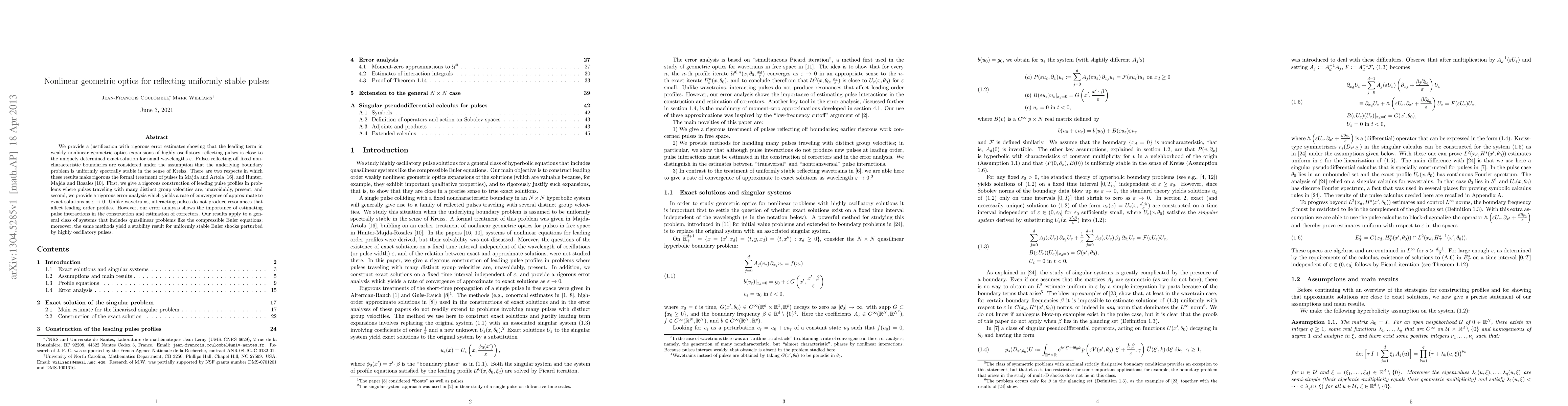 This paper rigorously justifies the leading term in weakly nonlinear geometric optics expansions for reflecting pulses, showing it closely approximates the exact solution for small wavelengths. It provides a rigorous construction of pulse profiles and error analysis for systems like the compressible Euler equations, establishing stability for perturbed uniformly stable shocks.