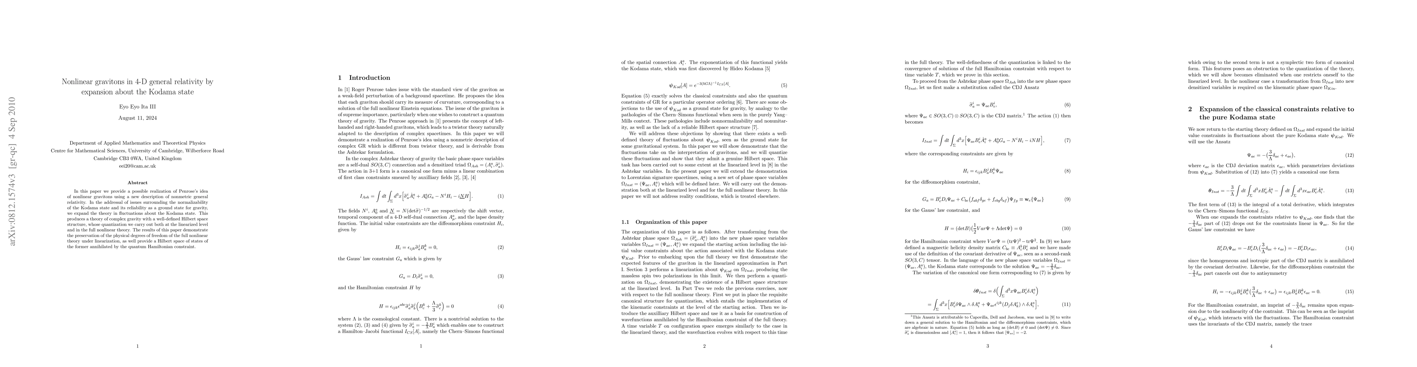 In this paper we provide a possible realization of Penrose's idea of nonlinear gravitons using a new description of nonmetric general relativity. In the addressal of issues surrounding the normalizability of the Kodama state and its reliability as a ground state for gravity, we expand the theory in fluctuations about the Kodama state. This produces a theory of complex gravity with a well-defined Hilbert space structure, whose quantization we carry out both at the linearized level and in the full nonlinear theory. The results of this paper demonstrate the preservation of the physical degrees of freedom of the full nonlinear theory under linearization, as well provide a Hilbert space of states of the former annihilated by the quantum Hamiltonian constraint.