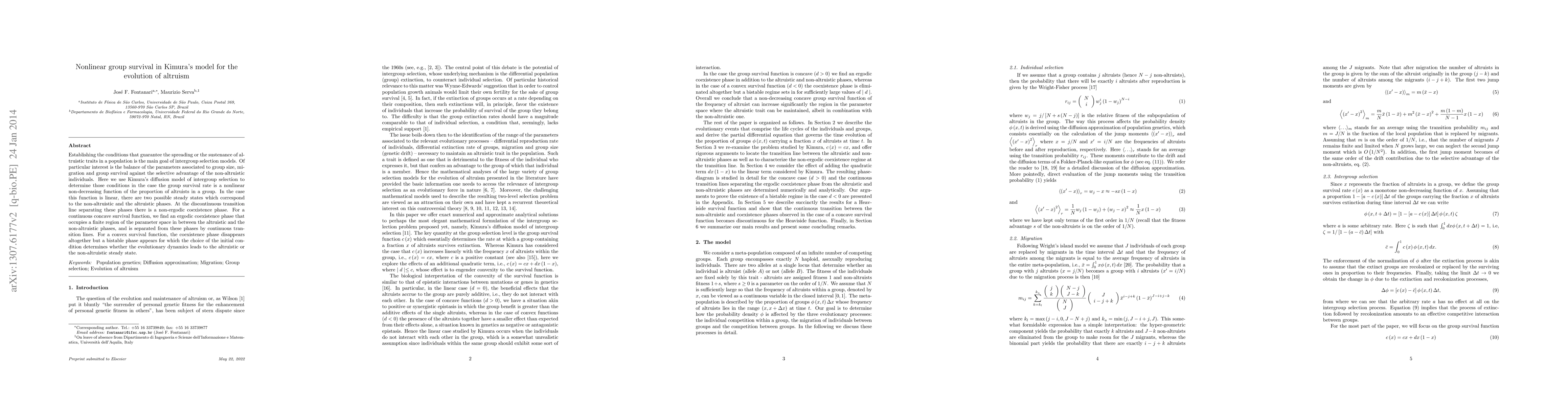 Establishing the conditions that guarantee the spreading or the sustenance of altruistic traits in a population is the main goal of intergroup selection models. Of particular interest is the balance of the parameters associated to group size, migration and group survival against the selective advantage of the non-altruistic individuals. Here we use Kimura's diffusion model of intergroup selection to determine those conditions in the case the group survival probability is a nonlinear non-decreasing function of the proportion of altruists in a group. In the case this function is linear, there are two possible steady states which correspond to the non-altruistic and the altruistic phases. At the discontinuous transition line separating these phases there is a non-ergodic coexistence phase. For a continuous concave survival function, we find an ergodic coexistence phase that occupies a finite region of the parameter space in between the altruistic and the non-altruistic phases, and is separated from these phases by continuous transition lines. For a convex survival function, the coexistence phase disappears altogether but a bistable phase appears for which the choice of the initial condition determines whether the evolutionary dynamics leads to the altruistic or the non-altruistic steady state.