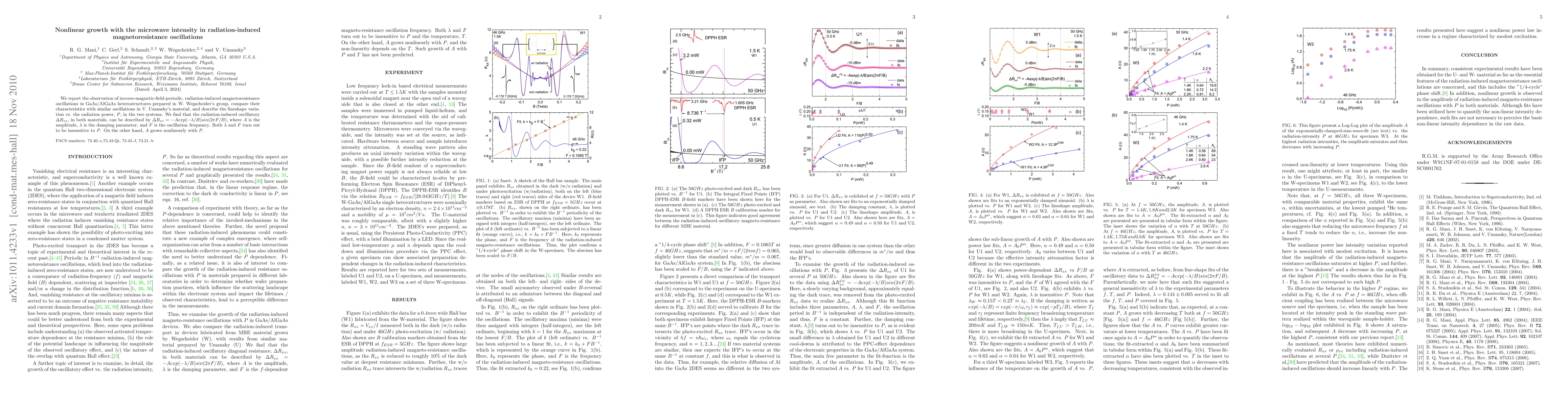 This paper reports on the observation of radiation-induced magnetoresistance oscillations in GaAs/AlGaAs heterostructures, showing that the amplitude of oscillations grows nonlinearly with radiation power, while the damping parameter and frequency remain constant. The findings are compared across two different material systems.
