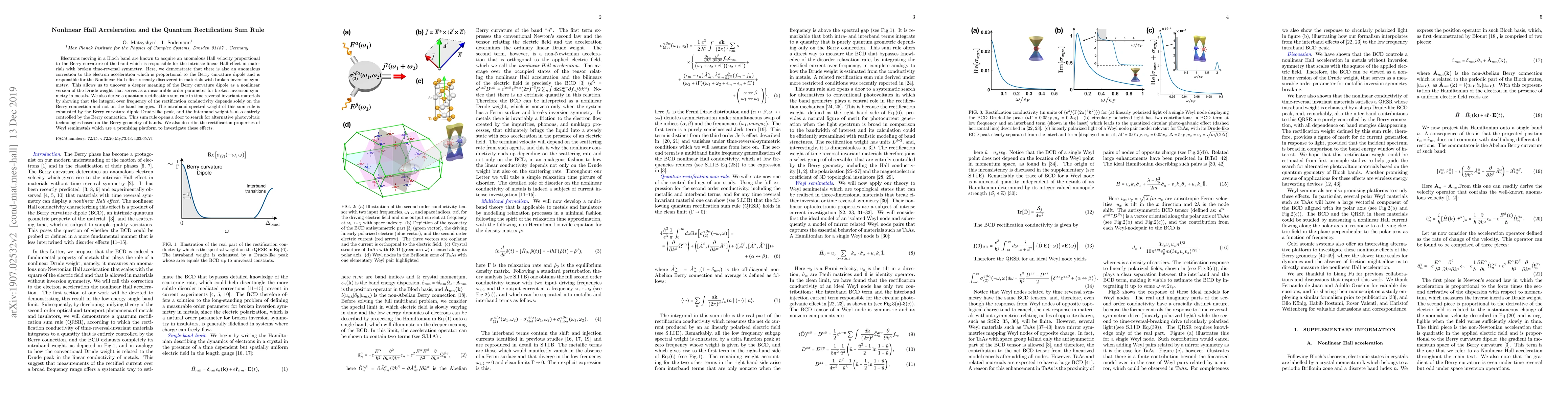 Electrons moving in a Bloch band are known to acquire an anomalous Hall velocity proportional to the Berry curvature of the band which is responsible for the intrinsic linear Hall effect in materials with broken time-reversal symmetry. Here, we demonstrate that there is also an anomalous correction to the electron acceleration which is proportional to the Berry curvature dipole and is responsible for the Nonlinear Hall effect recently discovered in materials with broken inversion symmetry. This allows us to uncover a deeper meaning of the Berry curvature dipole as a nonlinear version of the Drude weight that serves as a measurable order parameter for broken inversion symmetry in metals. We also derive a quantum rectification sum rule in time reversal invariant materials by showing that the integral over frequency of the rectification conductivity depends solely on the Berry connection and not on the band energies. The intraband spectral weight of this sum rule is exhausted by the Berry curvature dipole Drude-like peak, and the interband weight is also entirely controlled by the Berry connection. This sum rule opens a door to search for alternative photovoltaic technologies based on the Berry geometry of bands. We also describe the rectification properties of Weyl semimetals which are a promising platform to investigate these effects.