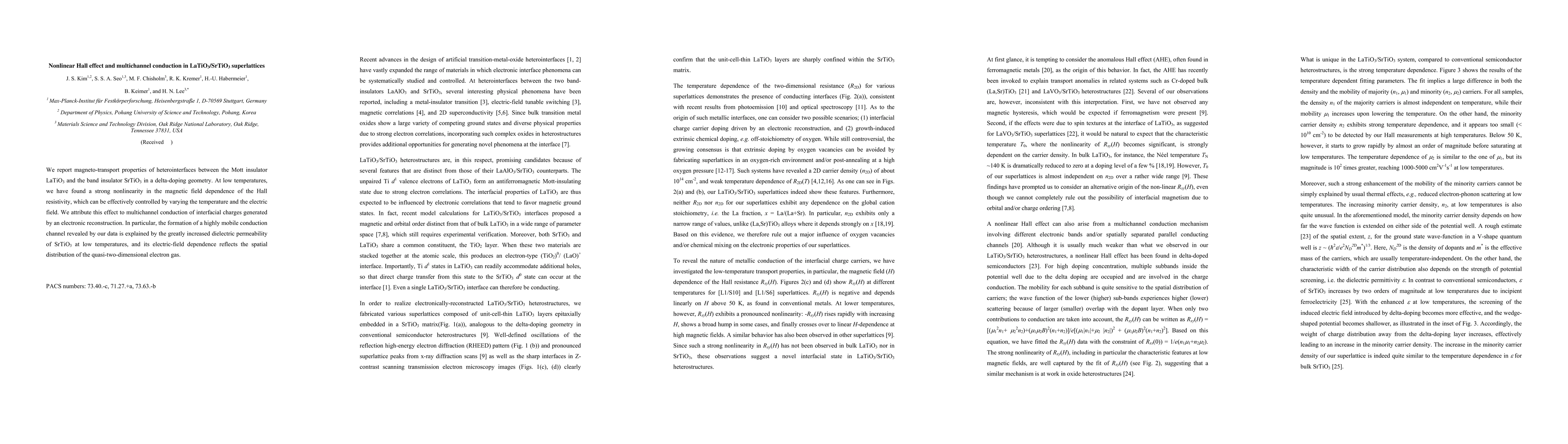This study investigates the magneto-transport properties of LaTiO3/SrTiO3 superlattices, revealing a strong nonlinear Hall effect at low temperatures due to multichannel conduction from interfacial charge reconstruction. The effect is modulated by temperature and electric field, linked to the enhanced dielectric permeability of SrTiO3 and the quasi-two-dimensional electron gas distribution.