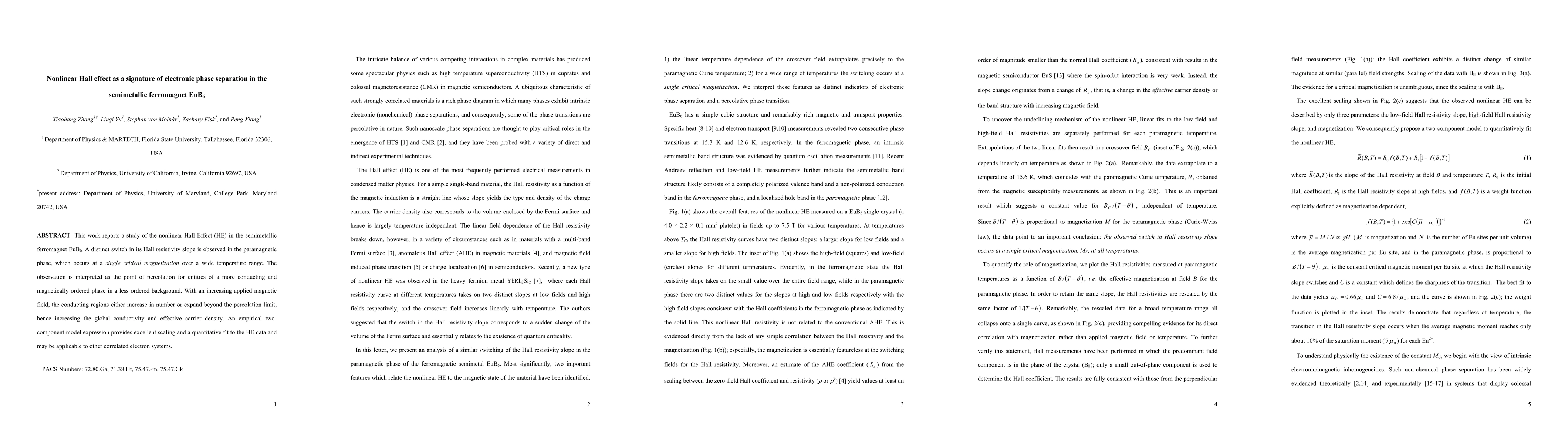This work reports a study of the nonlinear Hall Effect (HE) in the semimetallic ferromagnet EuB6. A distinct switch in its Hall resistivity slope is observed in the paramagnetic phase, which occurs at a single critical magnetization over a wide temperature range. The observation is interpreted as the point of percolation for entities of a more conducting and magnetically ordered phase in a less ordered background. With an increasing applied magnetic field, the conducting regions either increase in number or expand beyond the percolation limit, hence increasing the global conductivity and effective carrier density. An empirical two-component model expression provides excellent scaling and a quantitative fit to the HE data and may be applicable to other correlated electron systems.
