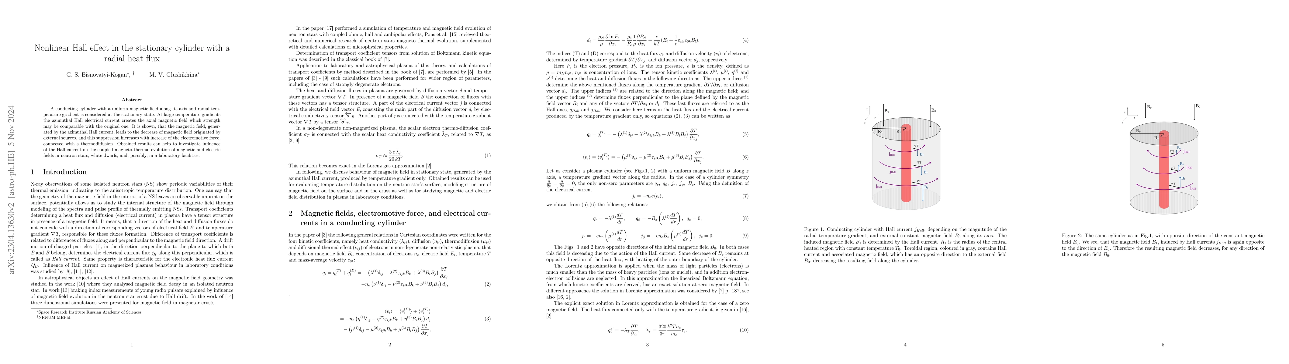 Summary: This study investigates a conducting cylinder subjected to a uniform magnetic field and a radial temperature gradient, revealing that a nonlinear Hall effect generates an azimuthal Hall current, which in turn creates an axial magnetic field that can diminish the original external magnetic field.