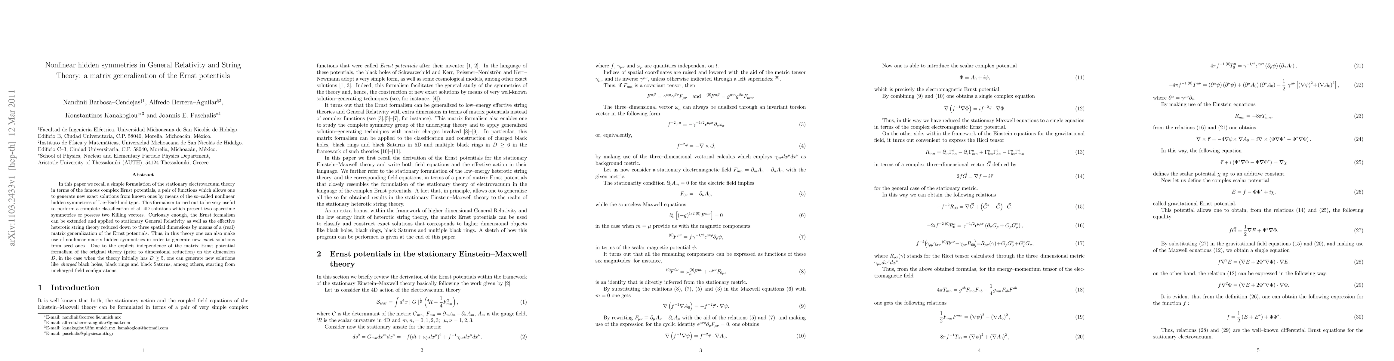 In this paper we recall a simple formulation of the stationary electrovacuum theory in terms of the famous complex Ernst potentials, a pair of functions which allows one to generate new exact solutions from known ones by means of the so-called nonlinear hidden symmetries of Lie-Backlund type. This formalism turned out to be very useful to perform a complete classification of all 4D solutions which present two spacetime symmetries or possess two Killing vectors. Curiously enough, the Ernst formalism can be extended and applied to stationary General Relativity as well as the effective heterotic string theory reduced down to three spatial dimensions by means of a (real) matrix generalization of the Ernst potentials. Thus, in this theory one can also make use of nonlinear matrix hidden symmetries in order to generate new exact solutions from seed ones. Due to the explicit independence of the matrix Ernst potential formalism of the original theory (prior to dimensional reduction) on the dimension D, in the case when the theory initially has D>=5, one can generate new solutions like charged black holes, black rings and black Saturns, among others, starting from uncharged field configurations.