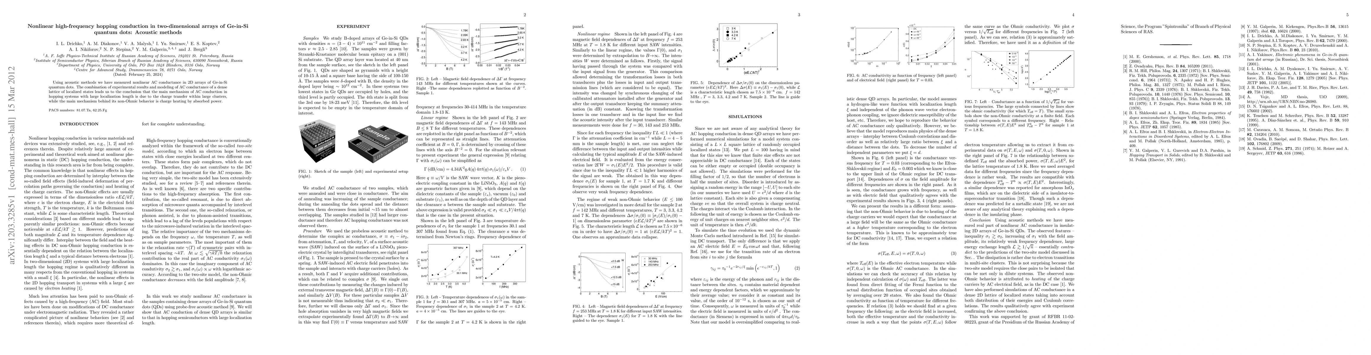 Using acoustic methods we have measured nonlinear AC conductance in 2D arrays of Ge-in-Si quantum dots. The combination of experimental results and modeling of AC conductance of a dense lattice of localized states leads us to the conclusion that the main mechanism of AC conduction in hopping systems with large localization length is due to the charge transfer within large clusters, while the main mechanism behind its non-Ohmic behavior is charge heating by absorbed power.