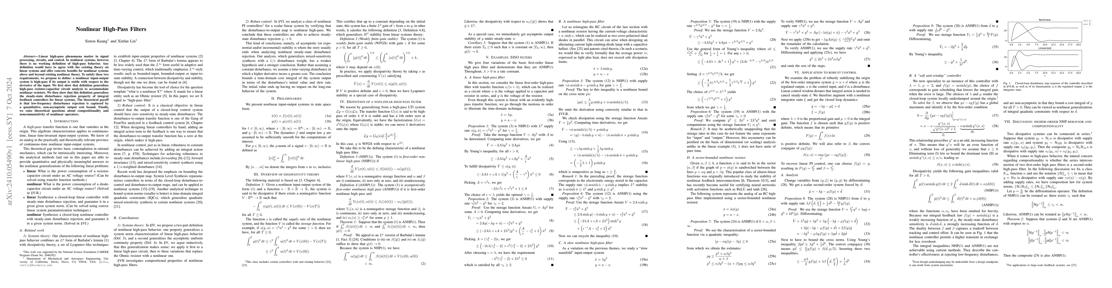 The paper introduces a new definition for nonlinear high-pass behavior, generalizing linear high-pass circuit analysis and integral feedback controller properties. It provides a quantitative, non-asymptotic output cost bound for low-frequency disturbance rejection in nonlinear systems using dissipativity theory and Lyapunov-style analysis.